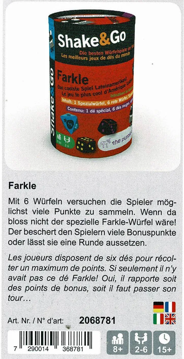 Farkel is a proprietary version of the traditional dice game Farkle (or Dix Mille), and is a push-your luck game played with six dice. You roll 6 dice, and remove any dice you want to use for points. You can stop, keeping the points, or re-roll the remaining dice. Points can be scored by specific numbers (e.g. 5 or 1) or sets of the same number. If you can use all six dice for points, pick them all up and keep going.