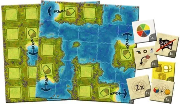 The game board is composed of nine, twelve or sixteen tiles, depending on the number of players. Players sail their ships through the landscape created for this game, landing on islands to plan and build settlements, which then supply resources and allow the player to earn victory points. Players might want to invest in cannons to protect themselves from pirates roaming the waters or acquire progress tokens to gain special advantages.