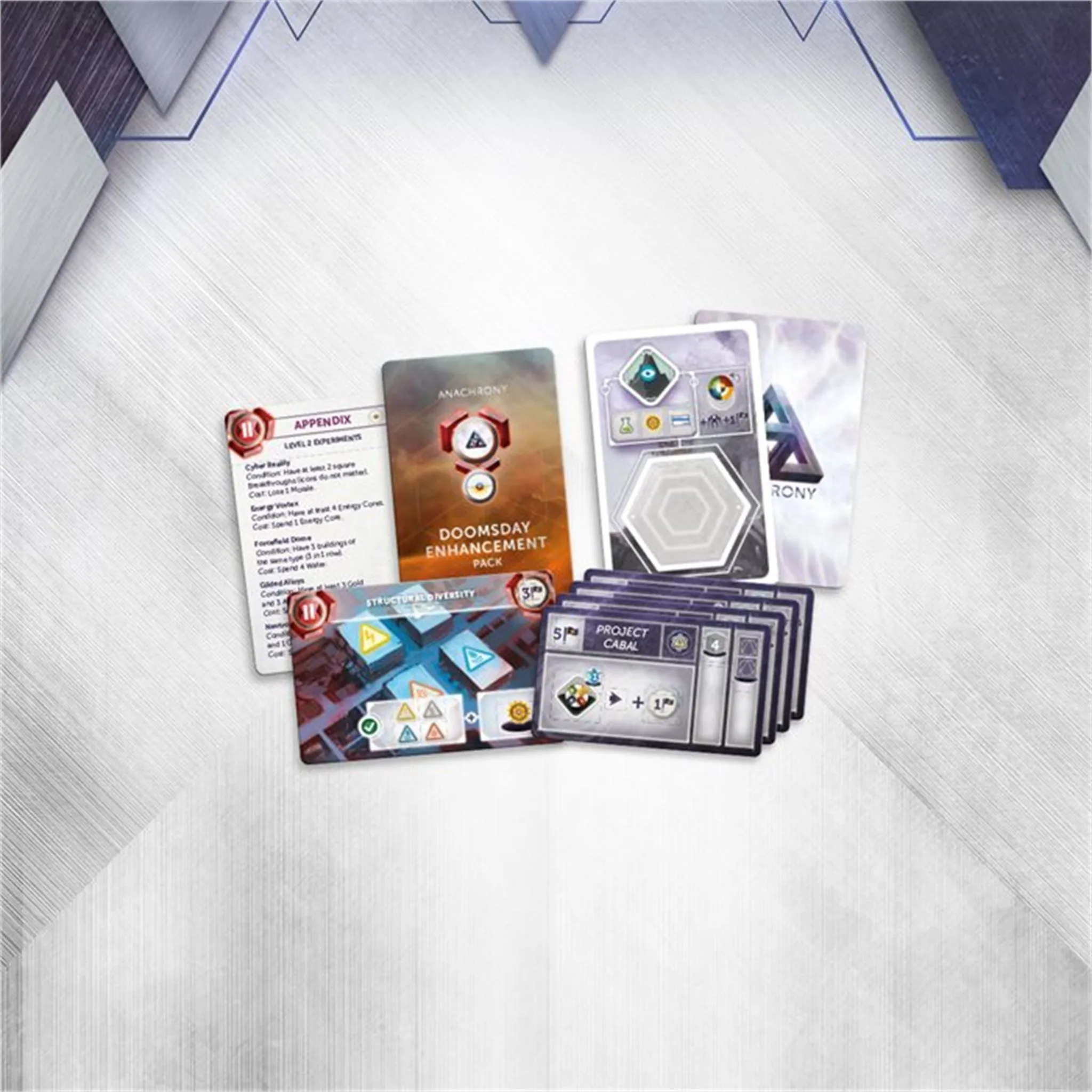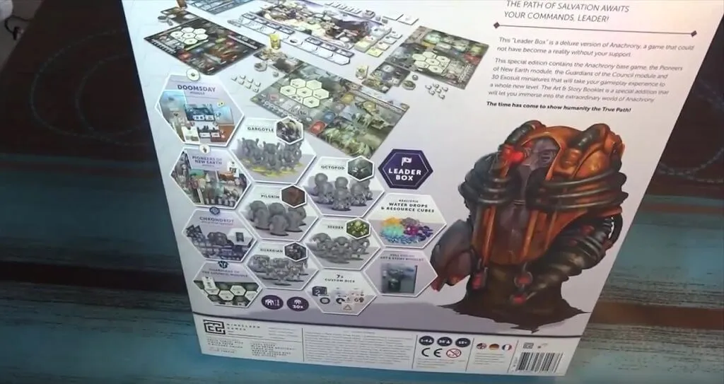 Le monde a changé. Nous sommes au 26 ème siècle et la Nouvelle Terre récupère peu à peu du Jour de la Purge : le jour où une explosion mystérieuse et catastrophique a secoué la planète entière. La majorité de la population a été exterminée et la majeure partie de la surface est devenue inhabitable. Personne n’a vraiment compris ce qui a causé cette apocalypse - la seule chose que les survivants ont pu faire a été de trouver un abri jusqu’à ce que la poussière soit retombée. Les restes de l’humanité se sont organisés en quatre idéologies radicalement différentes appelées Voies : la Voie pacifiste de l’Harmonie, vivant avec la faune et la flore dans l’un des rares berceaux de nature qui a survécu ; la Voie reculée de la Domination, parcourant les océans sur leur gigantesque bateau-cité ; la Voie rusée du Progrès, observant la Terre depuis leur cité dans le ciel ; et la Voie religieuse du Salut, résidant dans de vastes salles souterraines. Les adeptes des quatre Voies vivent dans une paix fragile mais en isolation presque totale. Leur seul point de rencontre est la Capitale, la dernière cité indépendante de la Terre, dirigée par un organisme planétaire : le Conseil Mondial. Des années plus tard, des explorateurs ont découvert un riche filon d’une matière inconnue à l’endroit dévasté où s’est produite l’explosion du Jour de la Purge. Ils ont nommé ce métal le Neutronium. Ce matériau, dur et léger, est excellent pour construire des bâtiments. Pour commémorer le 300 ème anniversaire du jour de l’apocalypse, le Conseil Mondial a décidé de construire cinq monuments entièrement faits de Neutronium et représentant les quatre Voies et la Capitale Mondiale. Lorsque les célébrations ont commencé, les représentants des quatre Voies ont été témoins de l’événement qui bouleversa le plus la vie des humains depuis la Purge. Des failles temporelles du futur se sont ouvertes sur les monuments, révélant la vraie puissance du Neutronium : quand il est exposé à de l’énergie, il est capable d’ouvrir des passages à travers le temps. La connexion avec le futur a offert à l’humanité une croissance et une prospérité sans précédent mais a aussi conduit à une révélation sinistre : la Purge était le résultat de la toute première faille temporelle. L’énergie dévastatrice d’un futur impact d’astéroïde a été transférée dans le passé à cause de l’énorme quantité de Neutronium contenue au sein de l’astéroïde. Cet impact se profile maintenant à l’horizon, menaçant de dévaster non seulement le passé, mais aussi le futur. Avec les ressources du présent et du futur à sa disposition, chaque Voie va tout faire pour se préparer à l’impact imminent - et dominer le futur de l’humanité en tant que seule vraie Voie. L’édition essentielle d’Anachrony ne comprend que le jeu de base et n’inclut pas d’autres modules, extensions ou figurines.