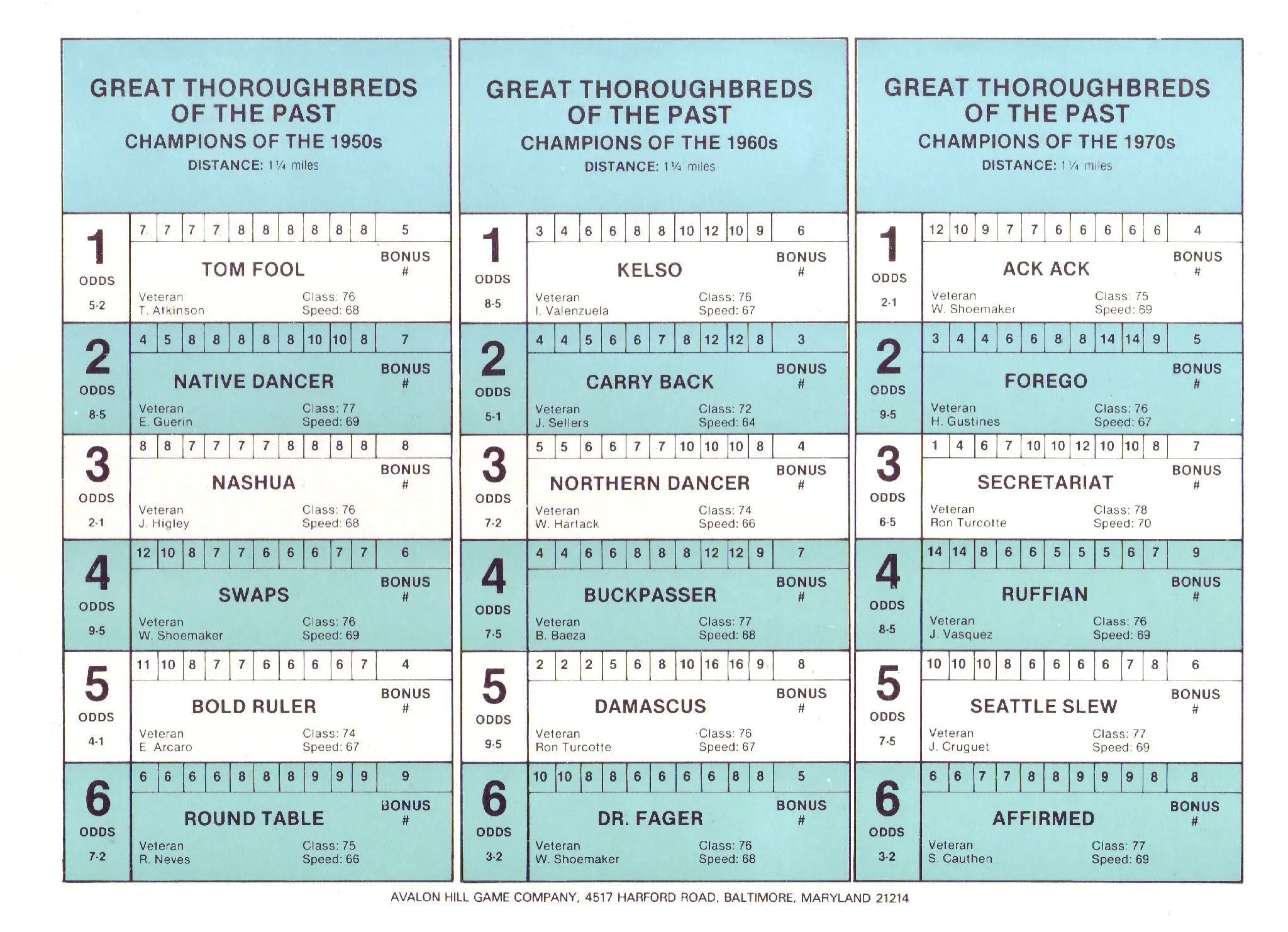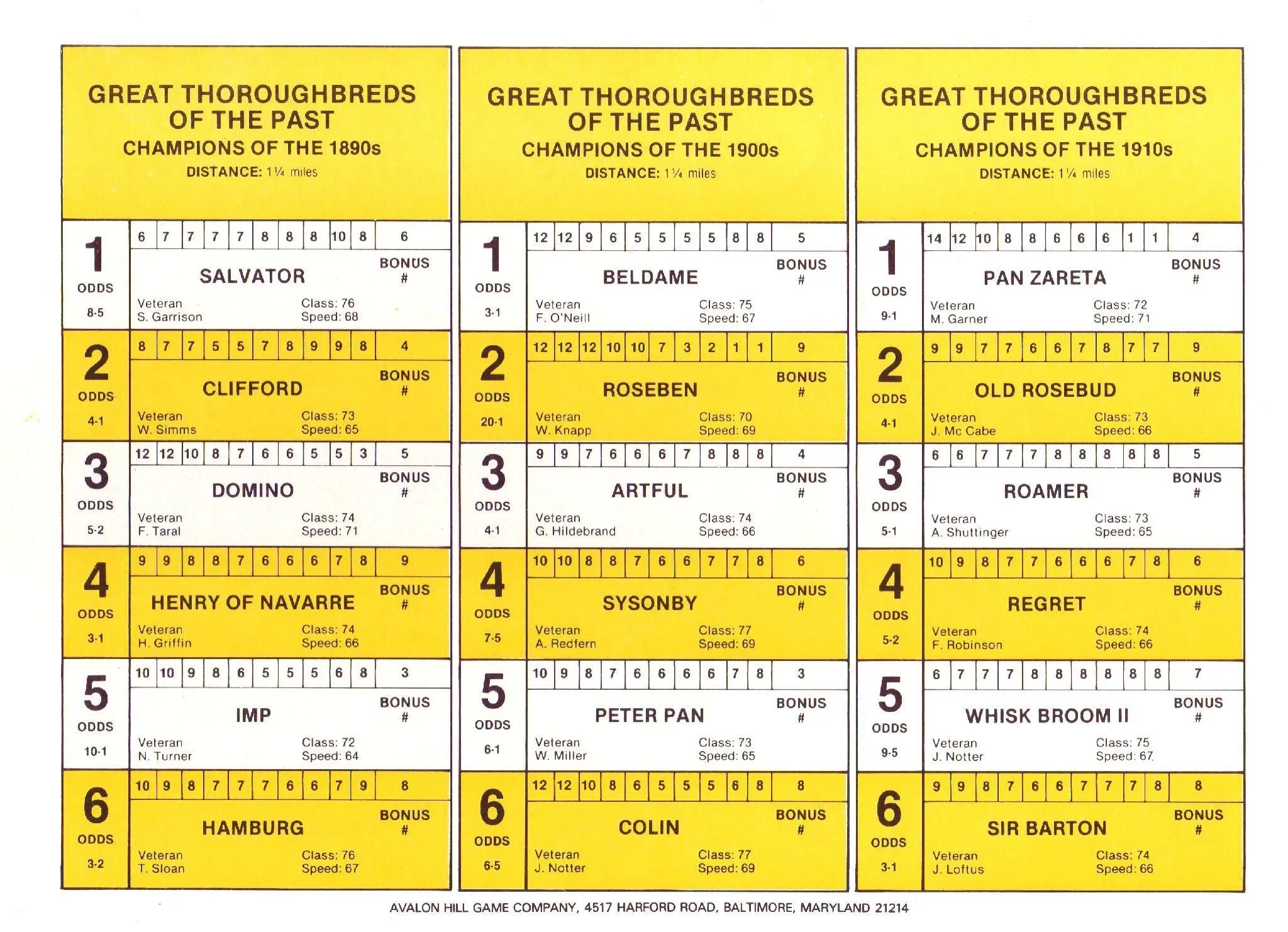 A race meeting consisting of 6 races, each with 6 horses of varying power and characteristics. Board shows an oval track of six lanes, straightforward in straights but graduated on the curves. Although dice play a part in the game there is plenty of room for skillful maneuvering in the course of each race, which can be from 5 furlongs to 1 1/4 miles. An important part of the game is provided by certain marked squares: if you can get your horse to stop on one of these it can overtake one horse ahead of it in the same line, which can be vital considering that only two swerves are permitted in each turn (only one if the jockey is an apprentice). Every horse has a distinctive racing pattern (slow or fast starter, stayer or fader etc.) represented by a set of numbers, one for each turn. These numbers are added to a single dice throw (common to all the horses), so that the speed of each race can vary substantially. There are many other interesting factors too numerous to describe in a short review. Odds on each horse are pre-set and depend largely on the number patterns described above.