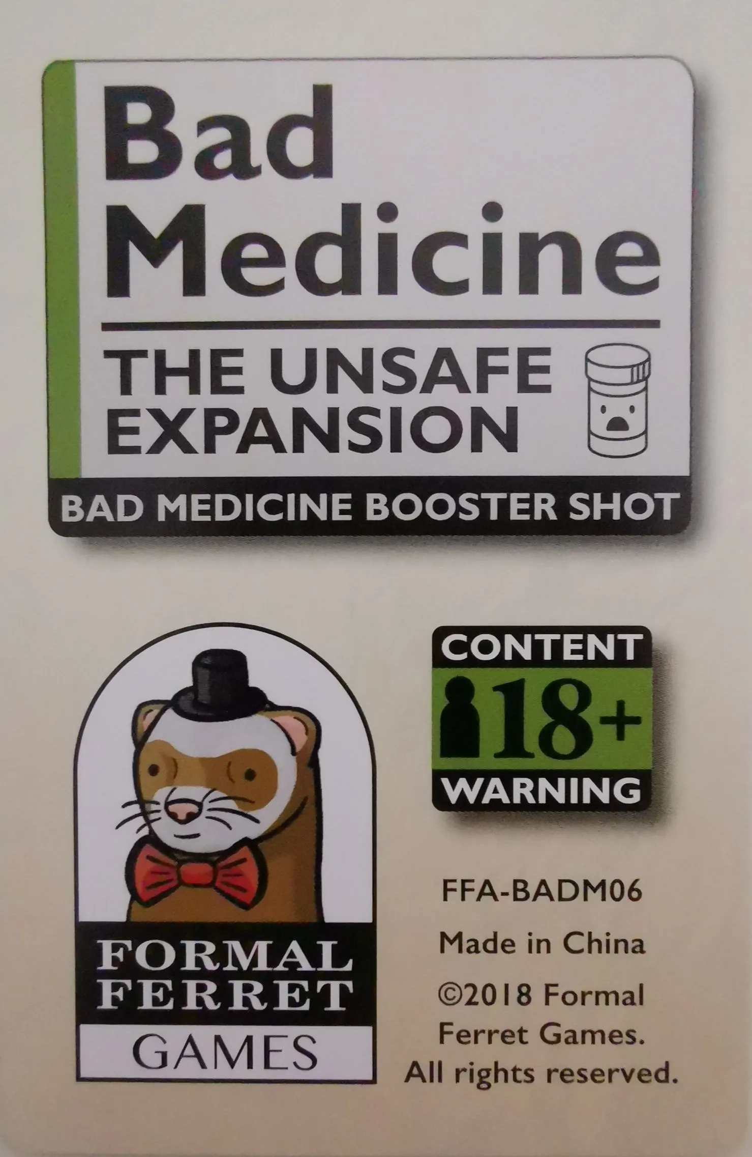 In a 3-4 player game, each player gets seven cards, and chooses three cards for their drug names and two cards for their descriptions. Once everyone has chosen their cards, everyone pitches their drug in turn. While one player is making his pitch, the other players pass a card to the pitching player. The pitching player chooses one card to incorporate into his pitch as a side effect, and explain why it’s not as bad as it sounds. The player whose side effect got chosen gets a point!