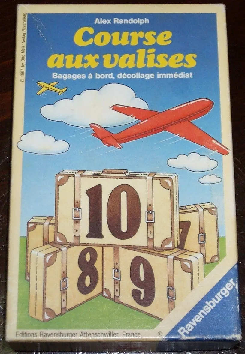 A Ravensburger small-box game. Each player controls an airplane that is flying to various “airports”. Each airport is a collection of face down baggage cards. Cards are numbered one through 10, with there being more 1’s than 10’s. The object of the game is to pick up baggage in ascending numerical order, being the first player to collect numbers 1 to 10.
