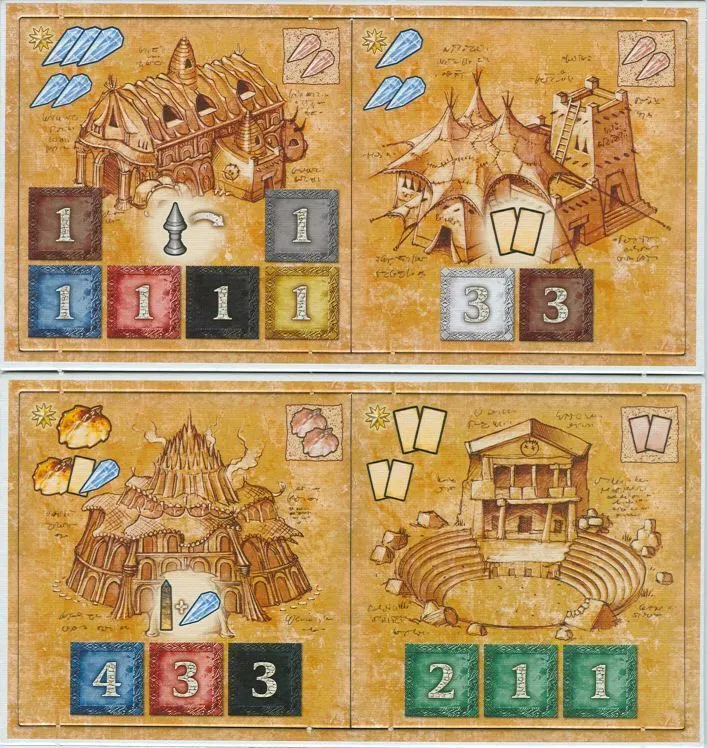 The player who first manages to add the required number of markers by paying crystals to the Obelisk wins the game. (four markers in a 4-player game, five markers in a 3-player game, and six markers in a 2-player game)