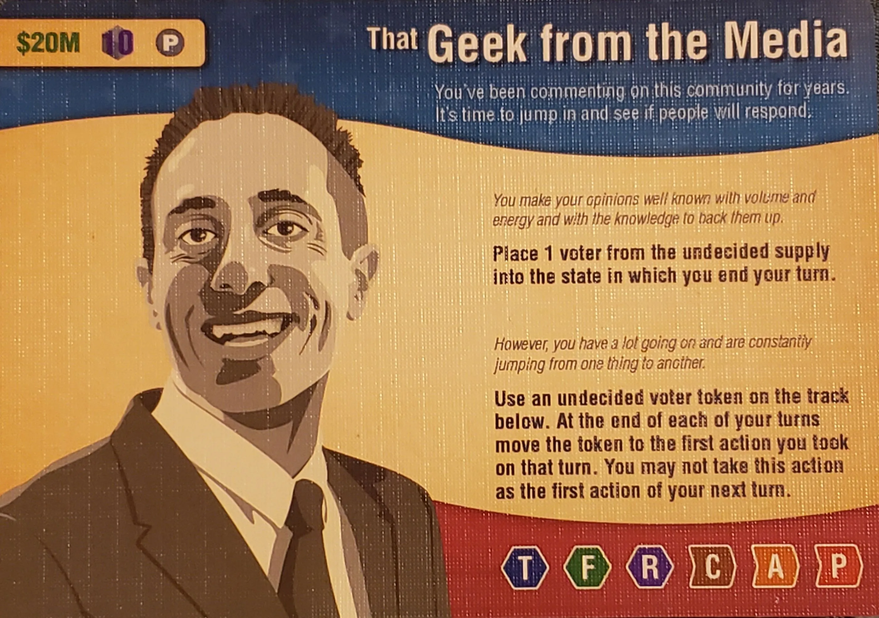 In addition to the base of card driven mechanics and area control, you will have a candidate card which gives you an individual player power. You will also have the opportunity to debate the current issues with your opponent. And finally, through the use of event cards, you can build up an engine to help out with resource production.