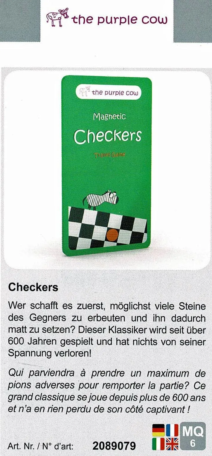 Abstract strategy game where players move disc-shaped pieces across an 8 by 8 cross-hatched (“checker”) board. Pieces only move diagonally, and only one space at a time. If a player can move one of his pieces so that it jumps over an adjacent piece of their opponent and into an empty space, that player captures the opponent’s disc. Jumping moves must be taken when possible, thereby creating a strategy game where players offer up jumps in exchange for setting up the board so that they jump even more pieces on their turn. A player wins by removing all of his opponent’s pieces from the board or by blocking the opponent so that he has no more moves. This game, also known as Draughts, is part of the Checkers family.