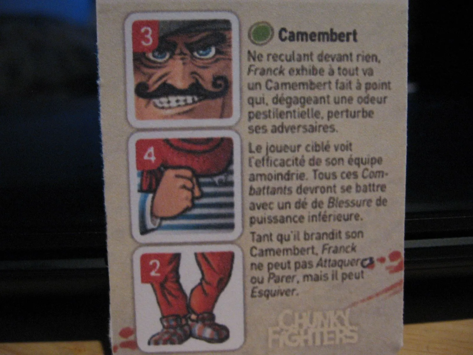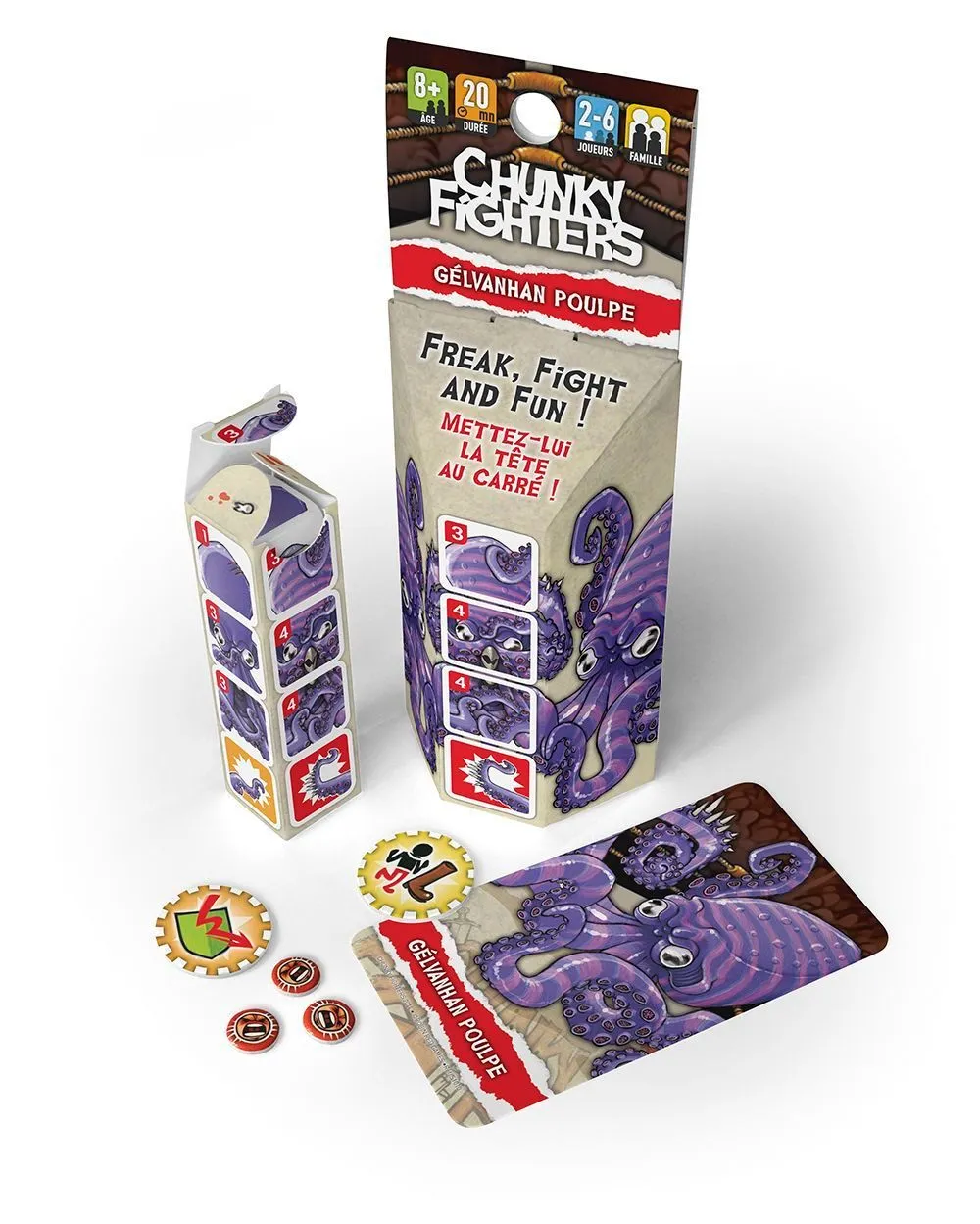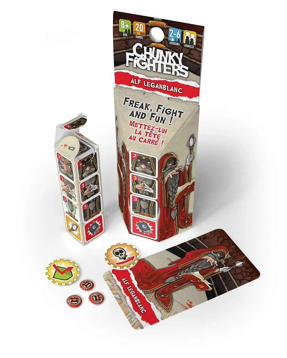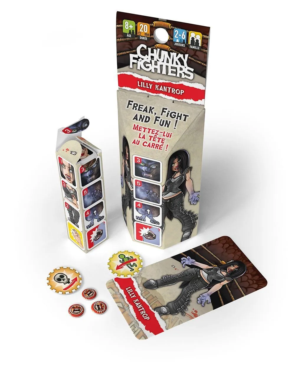 In Chunky Fighters, humorous characters fight it out in an all-or-nothing brawl. Players choose their fighters, then roll them to determine hit points and weapons. Each fighter is composed of four dice — head, body, legs, and weapon — along with a unique special ability card. Combat involves rolling damage and hit location dice. As fighters take damage, you rotate their body parts to show the remaining hit points until they’re finally destroyed.