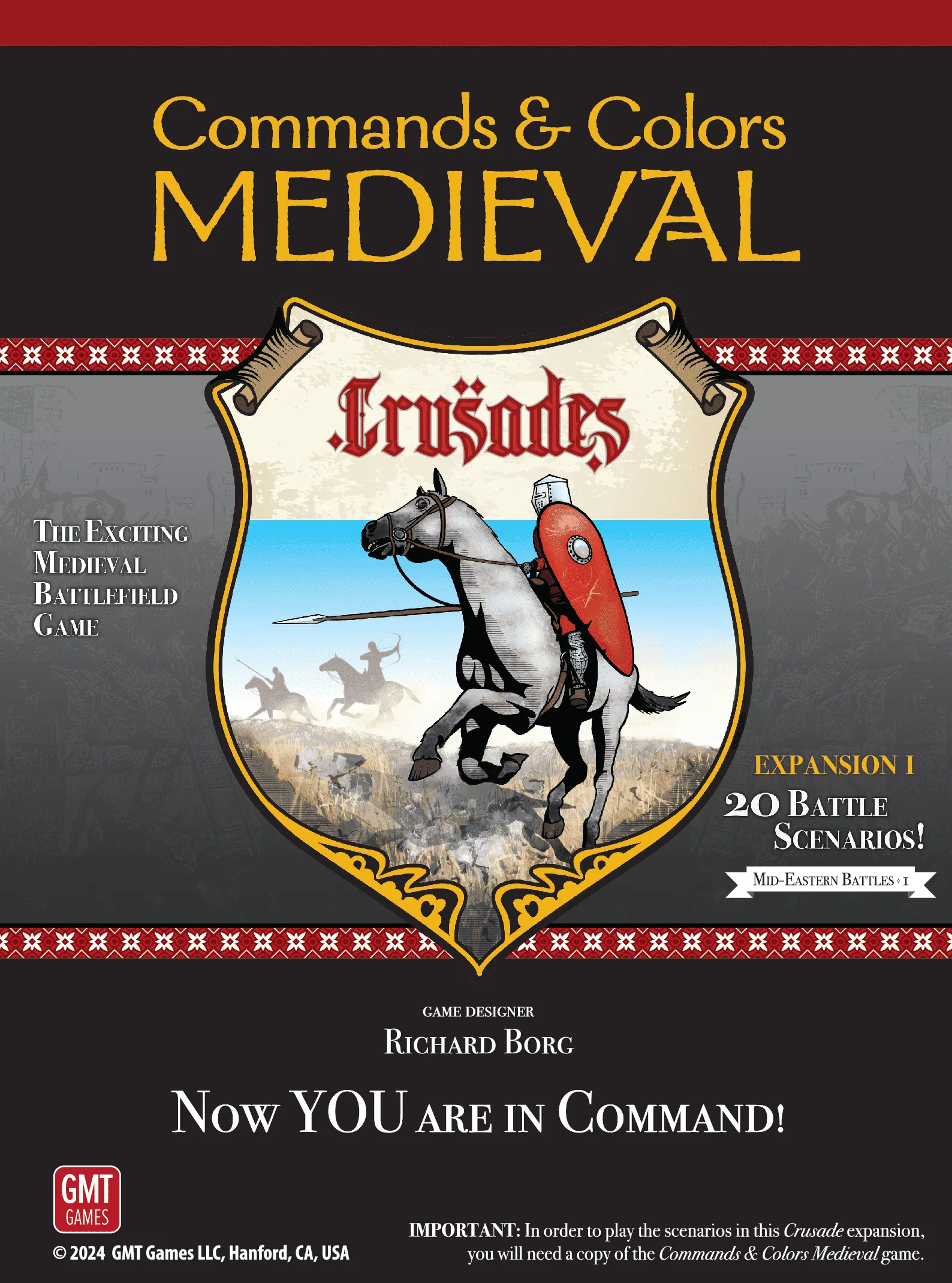 Still, some Commands & Colors game mechanics remain familiar to players of other games in the system, like the deck of Medieval Command cards that drive movement while creating a “fog of war,” and the battle dice that will resolve combat quickly and efficiently. The stylized battlefield scenario maps emphasize the important terrain features and highlight the historical deployment of forces in scale with the game system. The scale of the game is flexible, and varies from battle to battle. For some scenarios, a unit may represent a Chiliarchy of soldiers, while in other scenarios a unit may represent just a few brave warriors. The battlefield tactics, however, that you will need to execute to gain victory conform remarkably well to the strengths and limitations of the various medieval unit types, their weapons, the terrain, and history.