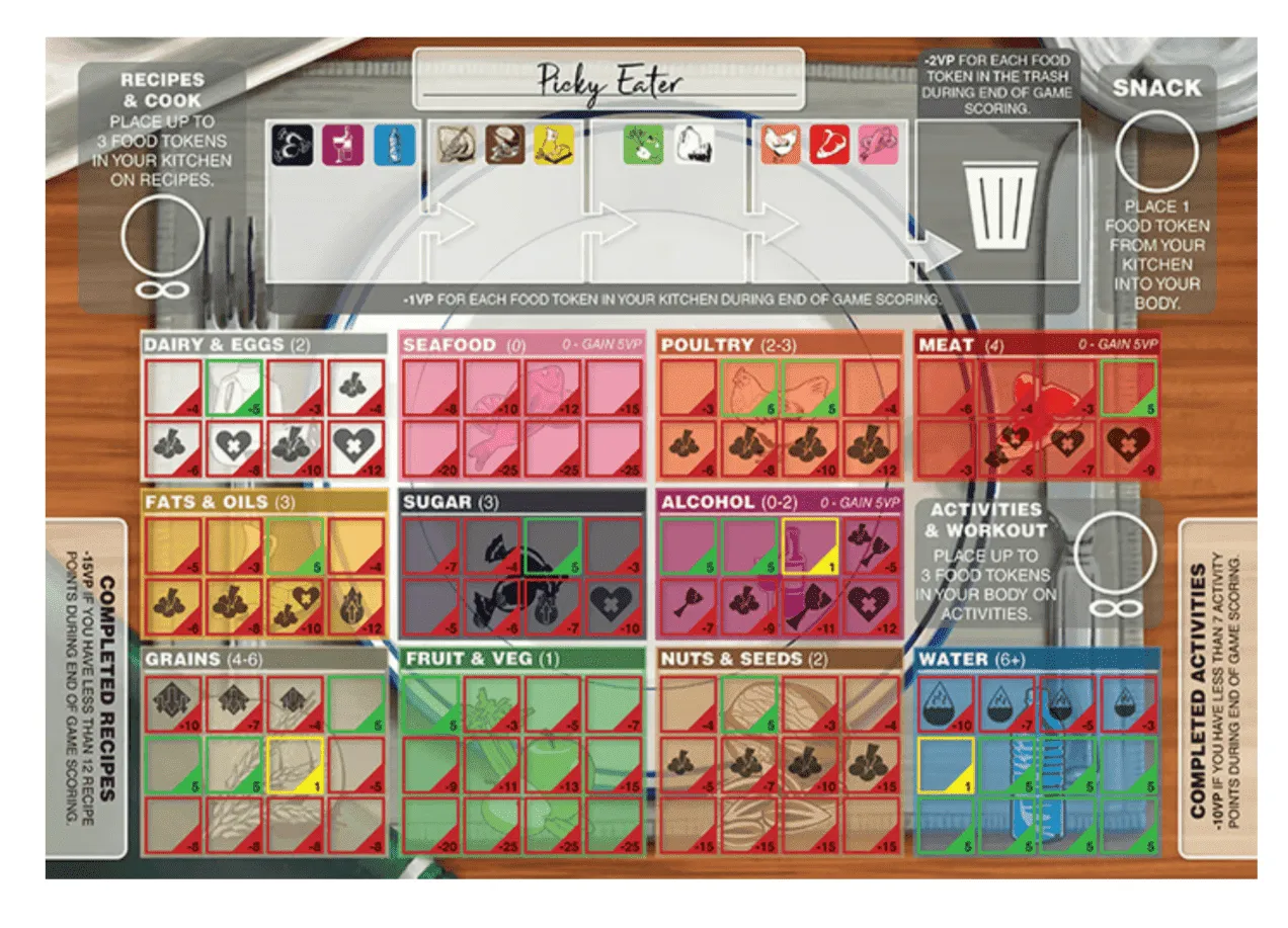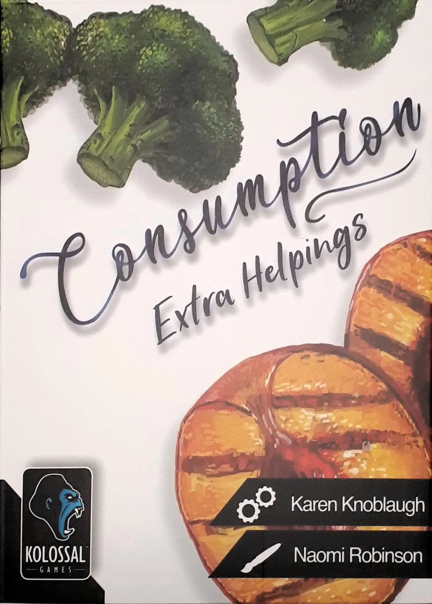 Consumption: Food and Choices is a worker placement and resource management game designed by a dietitian. Over six rounds players will shop for ingredients, cook recipes, dine out, and engage in activities—calories-in, calories-out! The player that best manages their body’s needs will win the game, all in the pursuit of health and happiness.