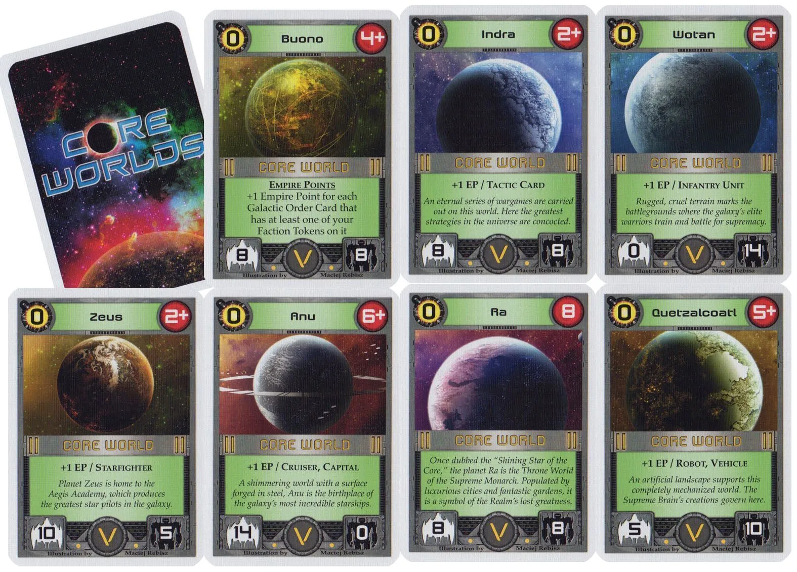Core Worlds is a deck-building card game for 2-5 players. The following are the central concepts of Core Worlds: