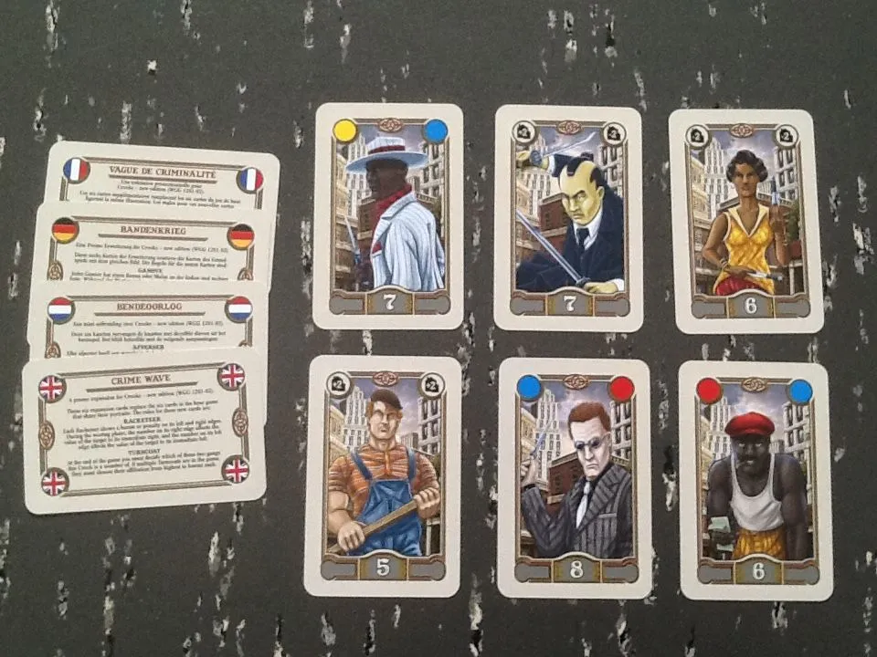 The second edition of Crooks features a cardboard box (instead of a tin), updated cards (with some crooks having new ranks), the removal of the Kingpin, a changed pickpocket rule, and a new type of card: the Support Crew, which affects the rank of the cards on its left or right.