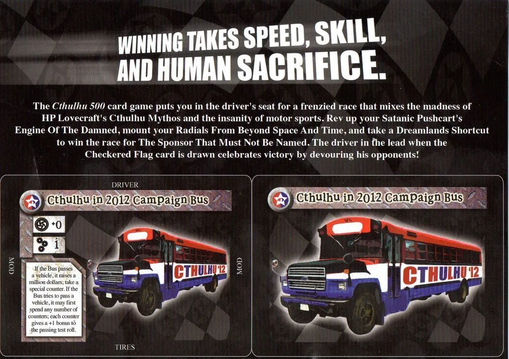 As the name suggests, Cthulhu 500 is a racing game with a Cthulhu Mythos theme. Each player chooses a car for the race, and as the game goes on can pick up special drivers/pit crews (such as “The Fungi from Detroit”), and car enhancements (such as “Rats in the Whitewalls”).