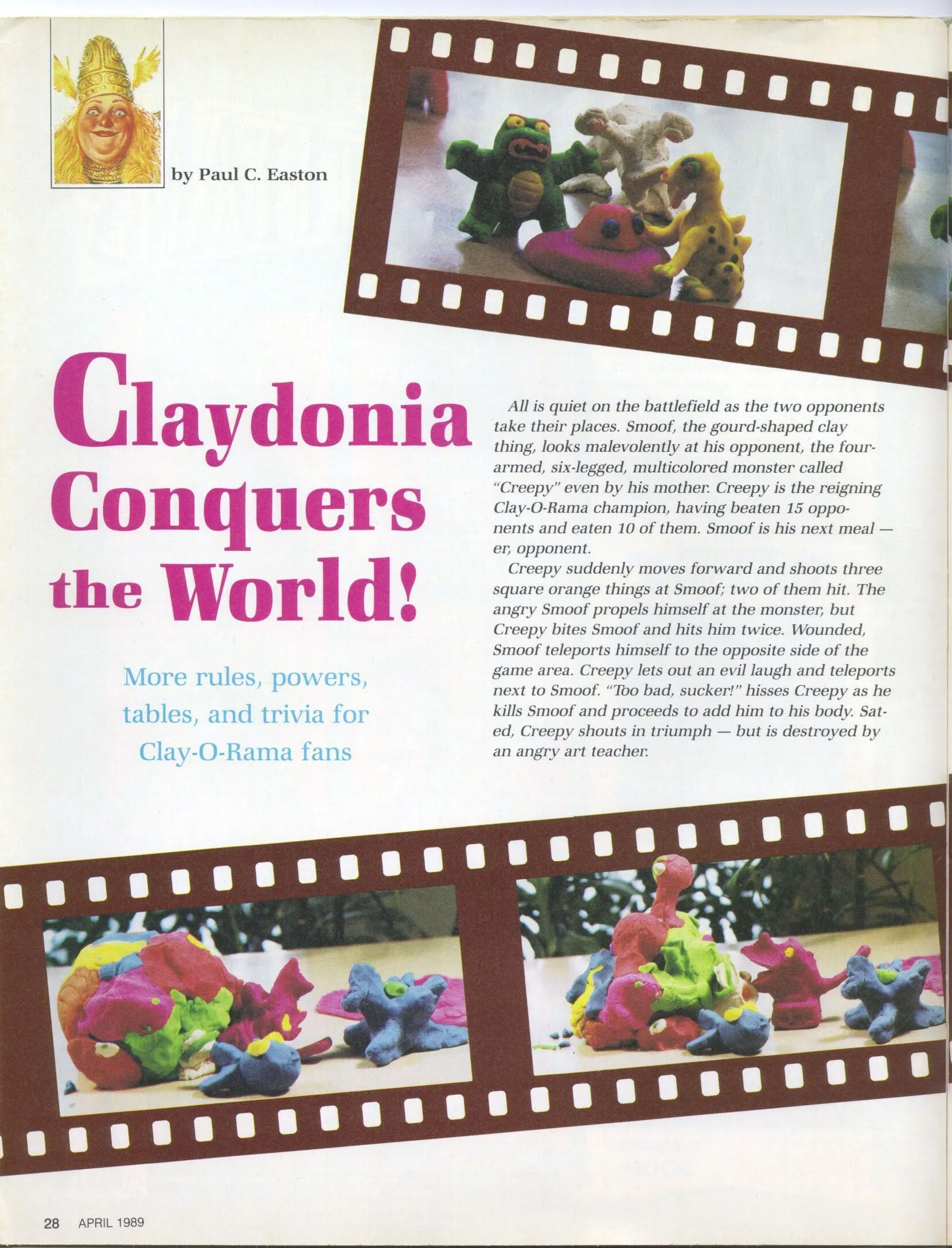 Clay-O-Rama is a silly game played with modeling clay (Which was published in the Dragon Magazine (issue 125)). Players create their own “claydonian” creatures, assign them powers, move them in hands breaths, depending on the number of lates they have. Creatures can attack, using powers such as “the drop” (drop your creature from 3’ and see if it survives); the bowl (use your creature like a bowling ball), the blob of death (if you hit, smash the creature with your fist), use opponent as missile… well, you get the idea.