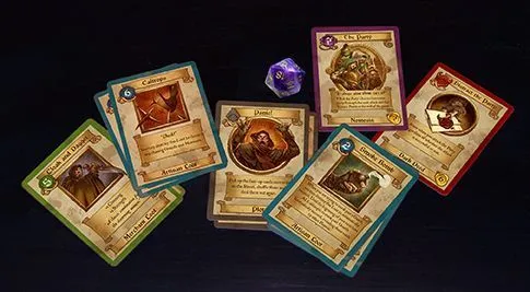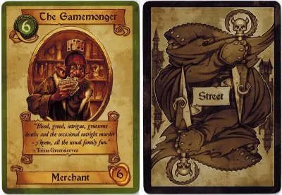 There’s a ‘street’ deck for the minion’s prospective targets – clerics, artisans, and merchants and their protective guards from the city watch. Then there’s a ‘tavern’ deck with potentially useful loot and plot cards to help the minions get the job done. The implacable hand of evil is revealed by the nemesis cards in the street deck – princes, politicians, and do-gooders the player’s evil patron wants eliminated. The tavern deck includes ‘Dark Deeds’, specific missions to take out particular nemeses (that’s the plural of nemesis in case you’re wondering). Picking up a Dark Deed is a very mixed blessing. A rich reward is earned for completing it, but it can’t be discarded and the patron will exact a heavy price for any incomplete Dark Deeds held at the end of the game.