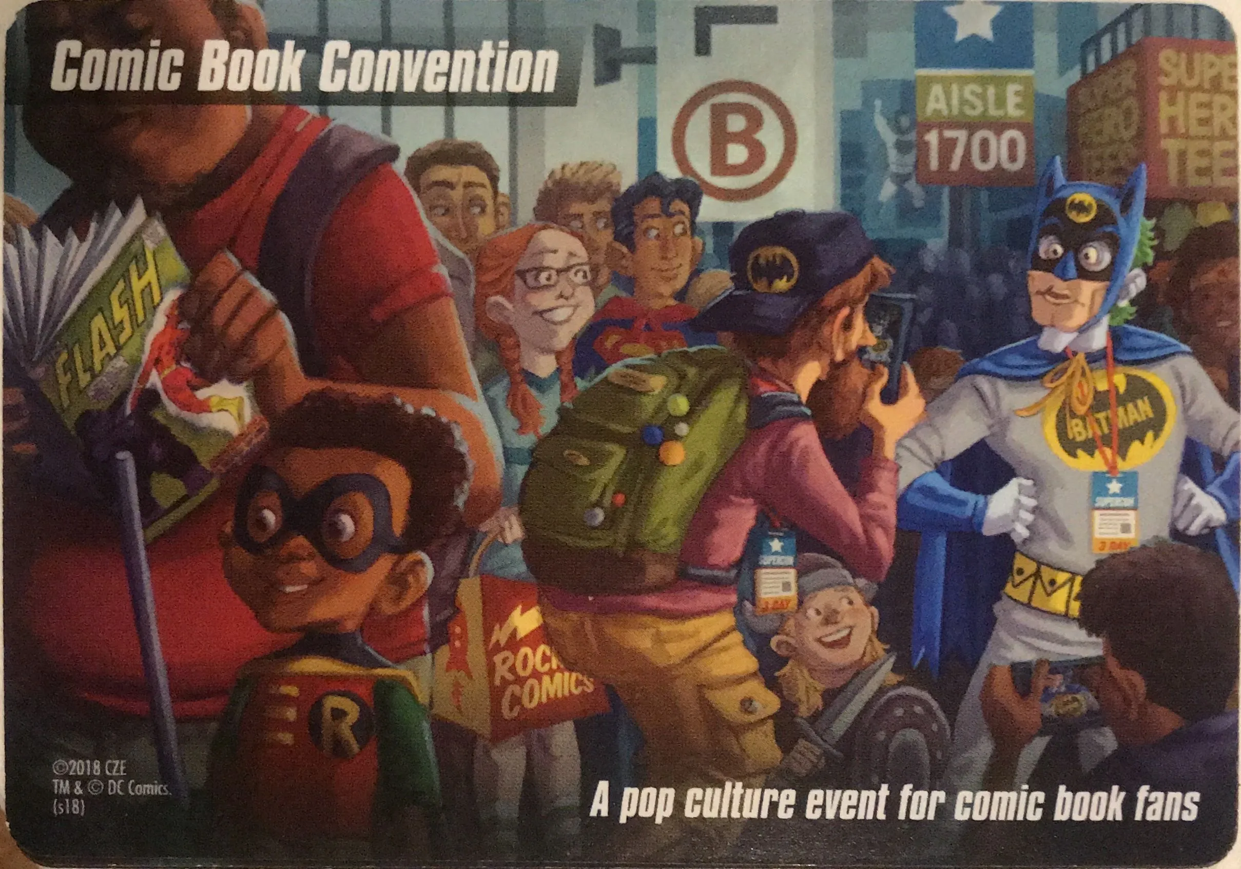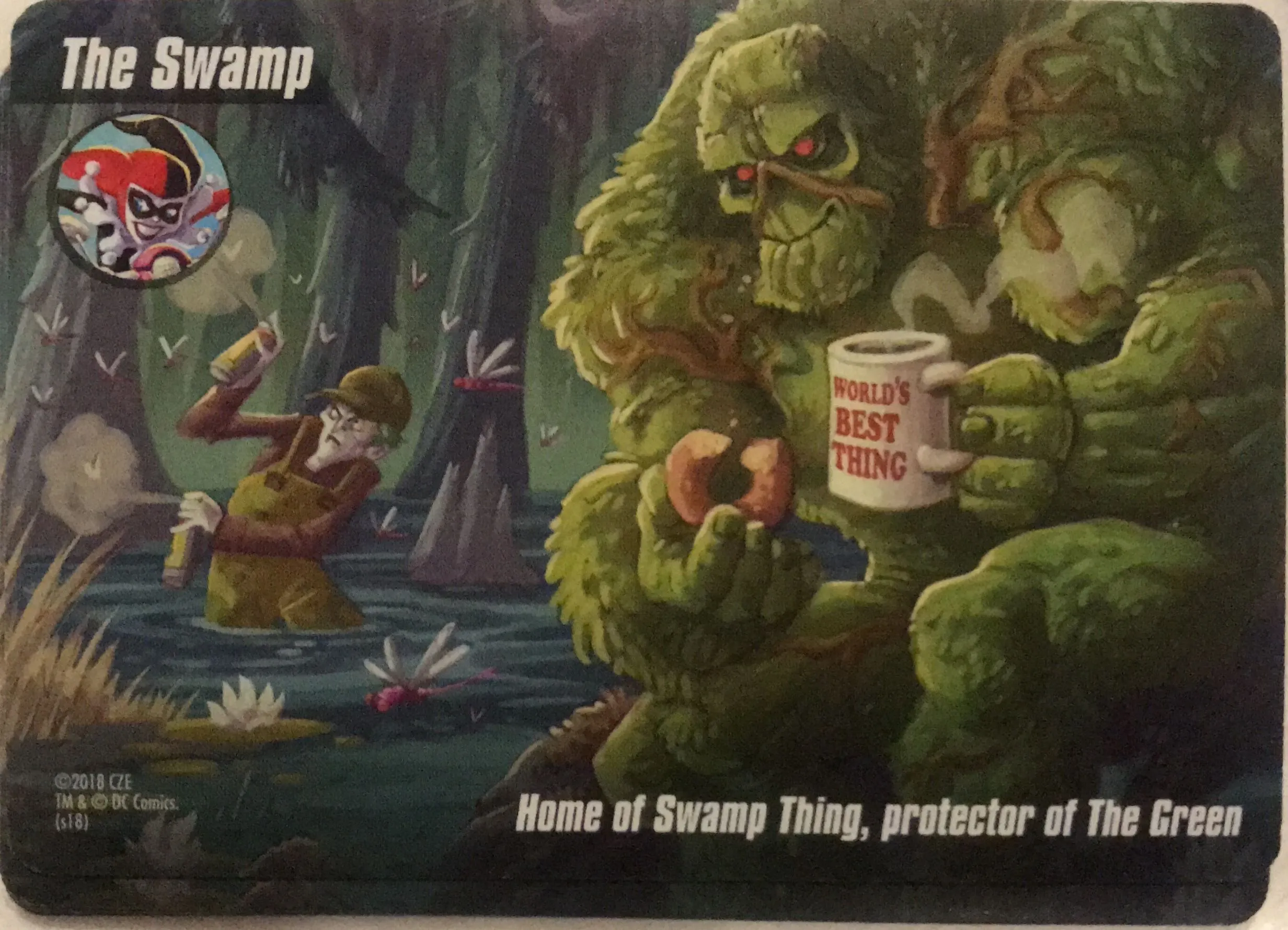 DC Spyfall includes a few twists on the Spyfall formula. Since Harley Quinn usually follows wherever the Joker goes, each round, one player may receive a location card with a Harley image; if they do, they try to feed the Joker player information about the location, even if they don’t know that player’s identity! If the Joker player guesses the location, the two collaborators each score points — unless the superheroes can turn the tables on them and determine who Harley is.