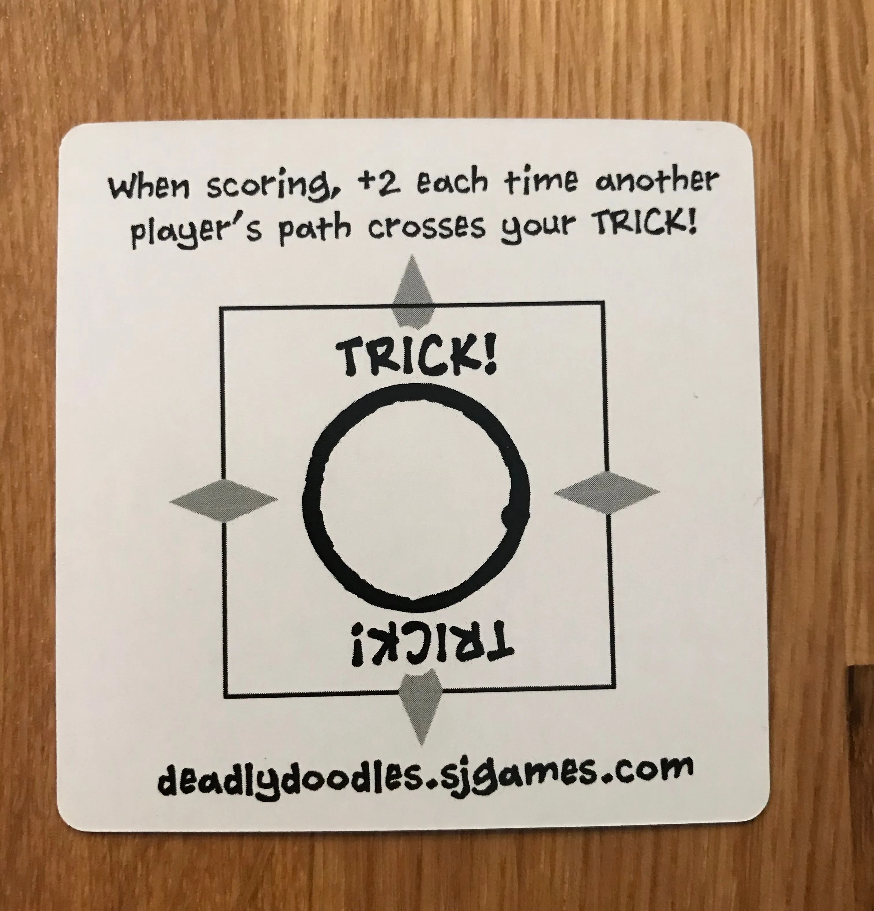 In Deadly Doodles, 1-4 players simultaneously draw paths through a dangerous dungeon. Draw cards, draw a path through your dungeon, and rack up points! Collect loot and fight monsters…or run away screaming! Can you defeat the dragon for the big score?