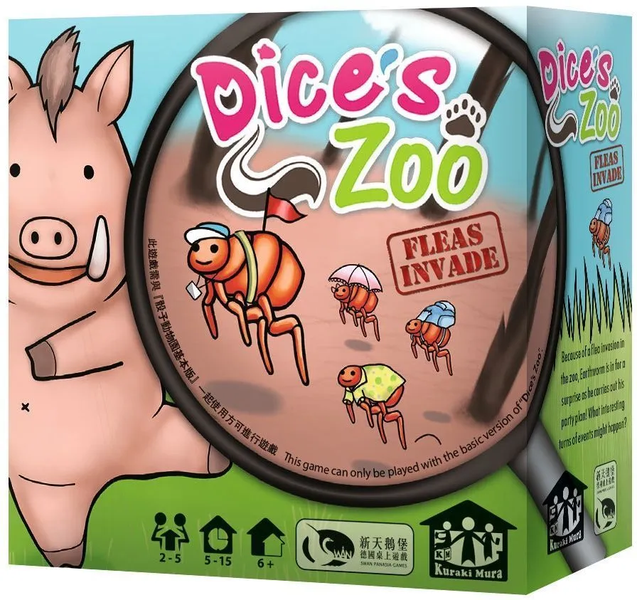 In Dice’s Zoo players compete to be the first to play out all twelve of their dice. On each side of each die is one kind of animal, some small and some large. When you play dice, you need to either play a bigger animal than the player before you or you can play the same animal but in a higher number. Whenever you play an animal, you may use that animal’s special ability, for example, to hinder your opponent or to help you get rid of your dice faster.
