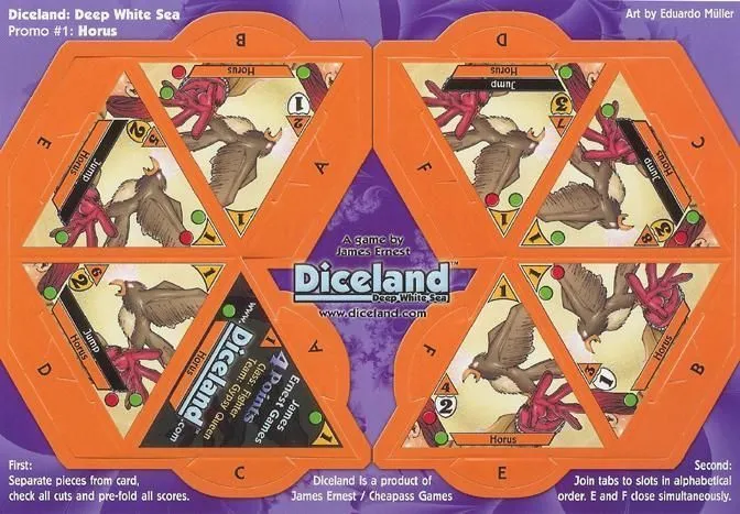 James Ernest once again stakes out some uncharted game design territory with Diceland: Deep White Sea. The game consists of five sets of octahedral stiff paper dice, about 2" per edge, with five team members per set. These dice have full-color comic-book style artwork by Eduardo Muller and game information printed on each face, and each die represents a character. Each die is pre-cut and scored, and assembles easily with just tabs and slots. Despite being made from “mere paper,” the dice are surprisingly sturdy, and the use of a good quality card stock means they tend to stay in good condition. Unless you accidentally sit on one, of course.