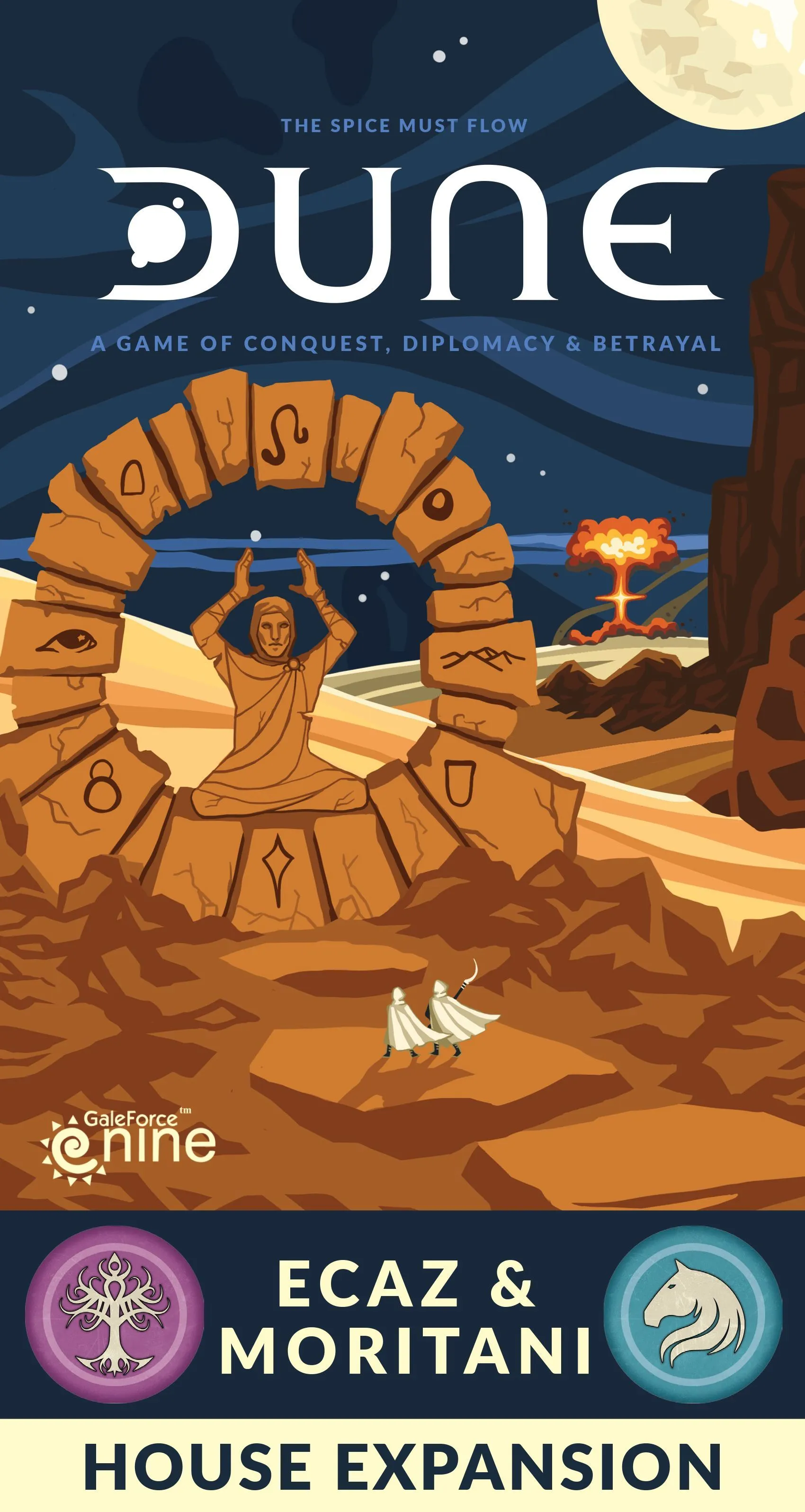 Dans DUNE, vous deviendrez le leader d’une des six grandes factions. Chacun souhaite contrôler la ressource la plus précieuse de l’univers - le Mélange, l’épice mystérieuse que l’on ne trouve qu’à grands frais sur la planète DUNE. Comme le dit le duc Leto Atreides : “Tout s’estompe avant le Mélange. Une poignée d’épices achètera une maison sur Tupile. Il ne peut pas être fabriqué, il doit être exploité sur Arrakis. C’est unique et il a de vraies propriétés gériatriques.” Et sans Mélange, les voyages dans l’espace seraient impossibles. Ce n’est qu’en ingérant la drogue qui crée une dépendance que la Guilde peut continuer à avoir des visions de l’avenir, ce qui lui permettra de tracer un chemin sûr à travers l’hyperespace.