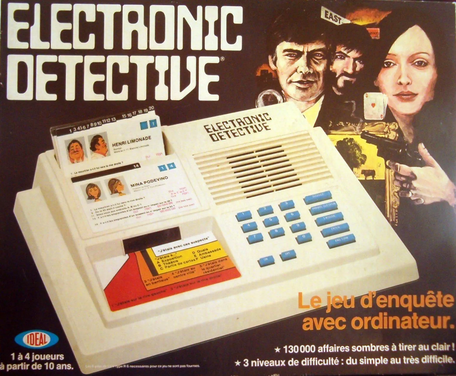 Each suspect card contains different questions you may ask to obtain vital information which will help you deduce the identity of the murderer. The computer becomes the suspects, as you “grill” them one by one. You have the questions and it has the answers. Get careless and you’ll ask for useless information. Ask a smart question and you’ll have a key fact in a flash! Electronic Display (light-emitting diodes) shows you the answers. Your case fact sheet helps you study and weigh the suspects’ statements, and logically follow the tangled web of evidence. Now you’re ready to make an accusation. If you’re correct the sirens sound. If not…Bang! Bang! The next victim is you and you’re out of the game! In its powerful microcomputer brain electronic detective has all the suspects’ alibis, plus key clues pertaining to the dastardly deed. Its electronic I.Q. is at your fingertips! You may recheck clues at any time using the computer’s electronic memory bank. Gun shots, police sirens, and the funeral dirge are all part of the game’s play. May be played at 3 different levels: “Gumshoe,” “Sleuth,” or “Master Detective.” Automatically switches off after game play is completed. Battery operated - 6 AA – you can play it anywhere.
