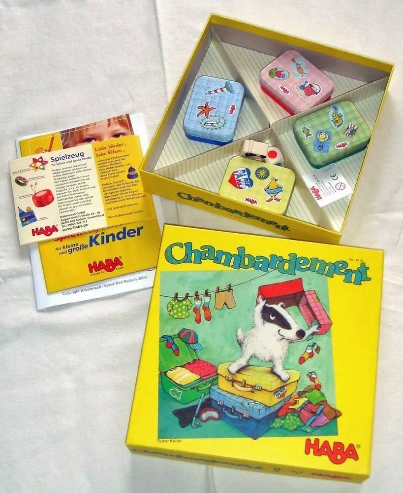 On a turn, the player rolls the die. If the die shows a color, the player places one of his items in the suitcase of this color; if the badger sits next to this suitcase, he places two items instead. If, however, the die shows a badger, the player must open the suitcase and reclaim all of the items packed inside – even if they weren’t his to begin with! He then moves the badger to the next suitcase in the circle. One bonus to this punishment: If a player ever has a complete set of garments, he returns one of each item to the game box, removing them from the game.