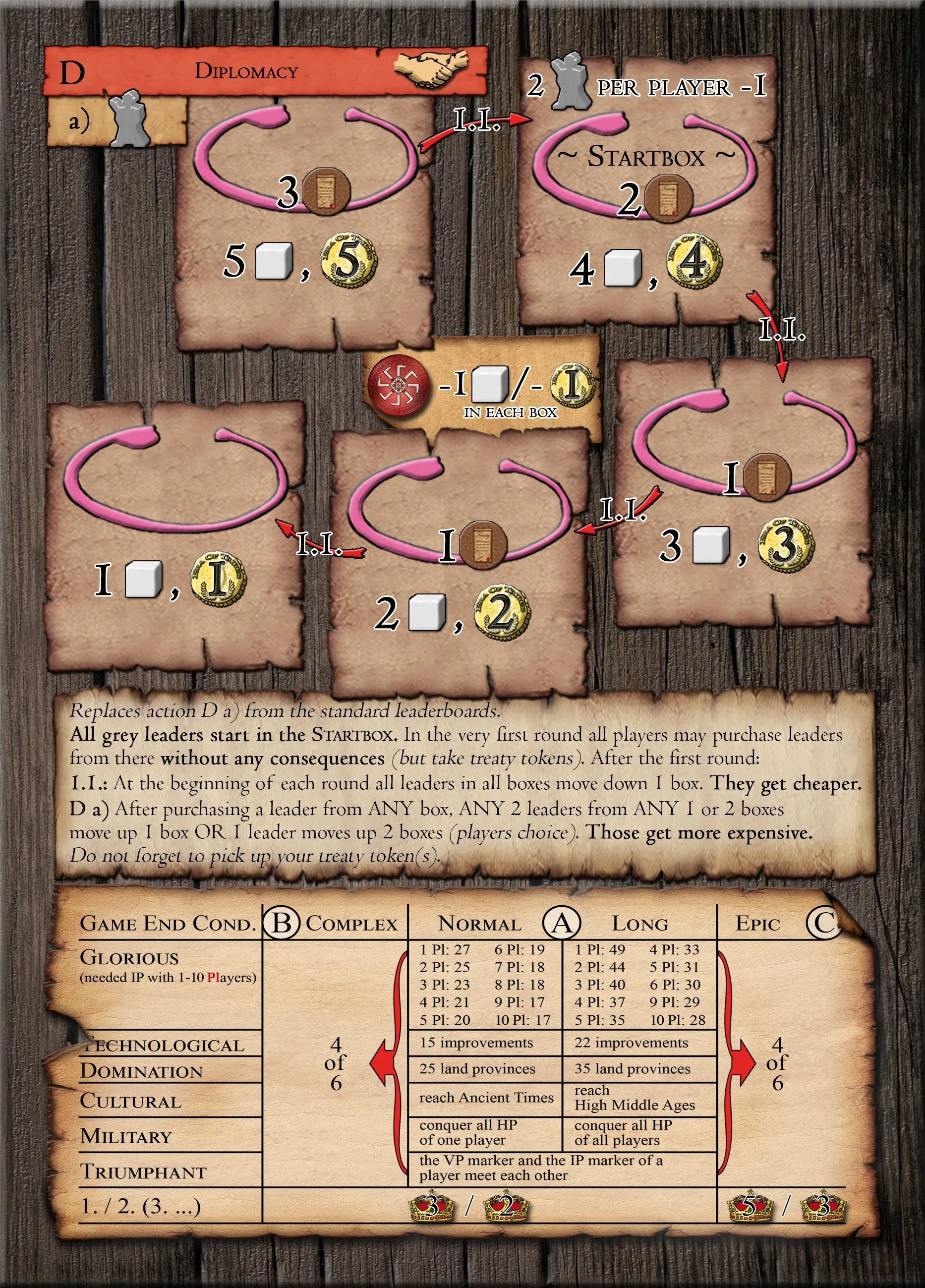 Your objective is to get the most Influence Points (IP) by the end of the game. To reach this goal, you have to develop your empire with the help of your leaders. Take turns placing them in the different boxes of your tribal action board, where they can help you in different and unique ways: