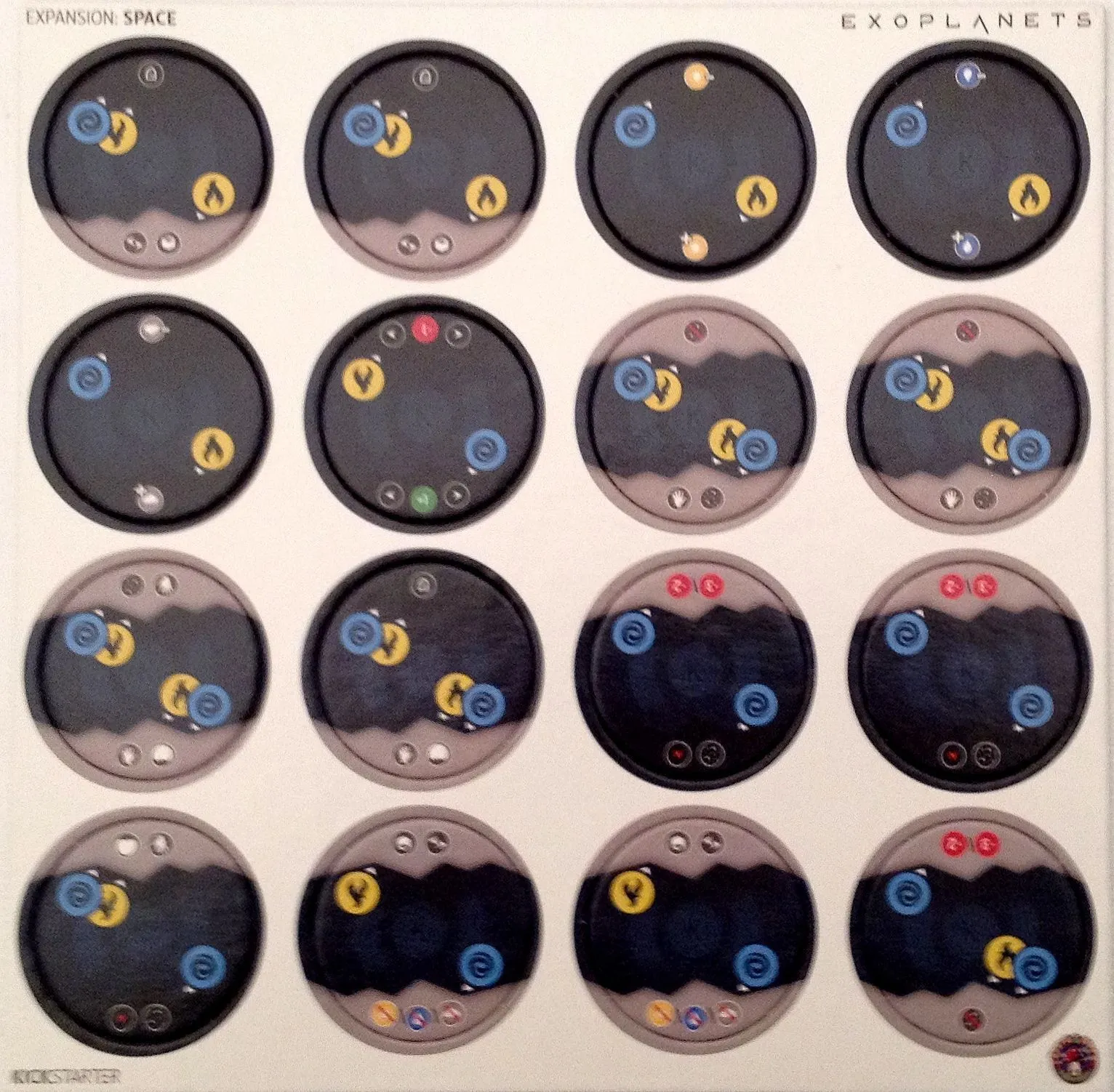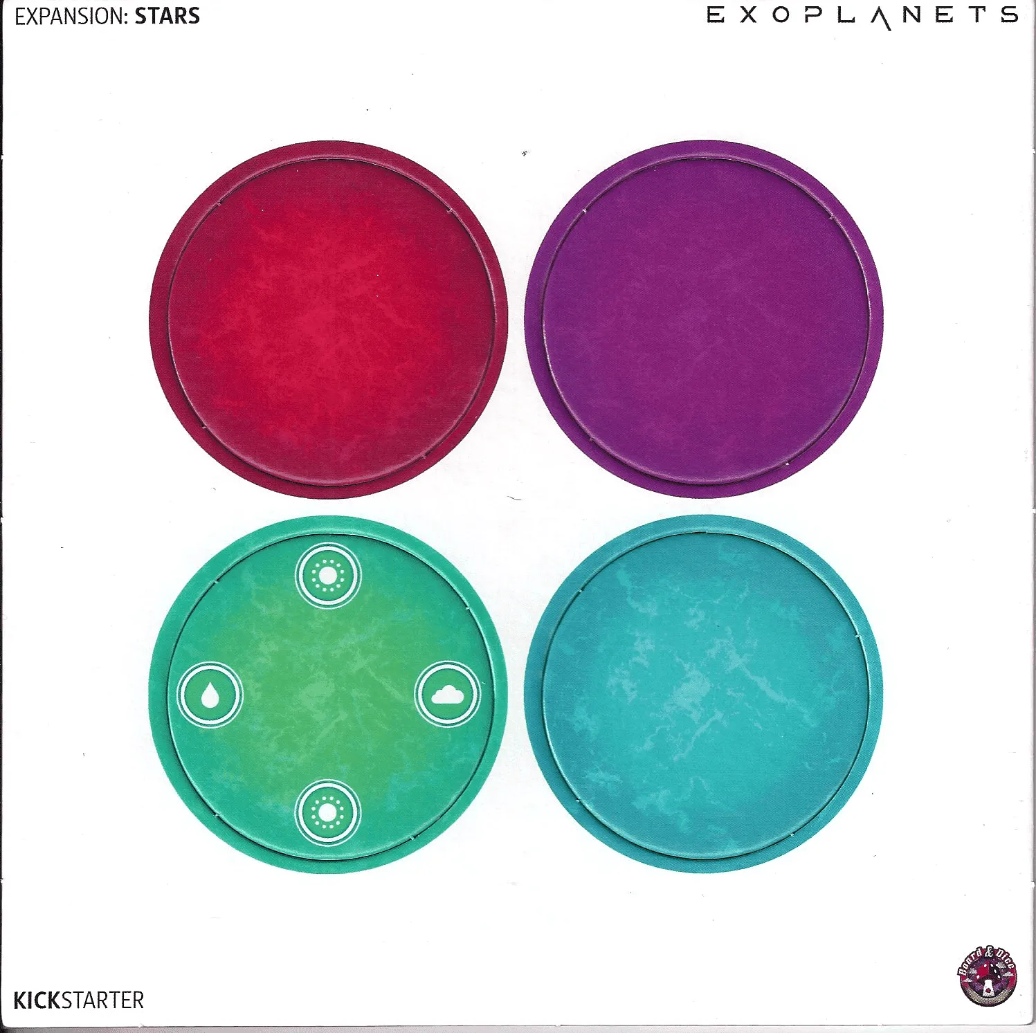 Exoplanets is a medium-light game, where players create their own planetary system on the table. Players add to the common star, tiles which represent various planets or moons (that protect planets or help create life). Each of these tiles/planets give a different number of tokens (water, atmosphere, asteroids and light) and each planet has their climatic condition, which allows us to create life on these planets. Players can also interact trying to interrupt opponents planets by using space effects, by space tales or fulfill goals to earn more points at the end of the universe. But the players need to know that they are all creating mutual planetary systems.