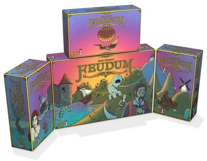 Feudum (latin for fiefdom) is an economic medieval game of hand and resource management for 2-5 players. With many strategies at their disposal, players optimize four actions per turn in attempt to score the most victory points over five epochs.