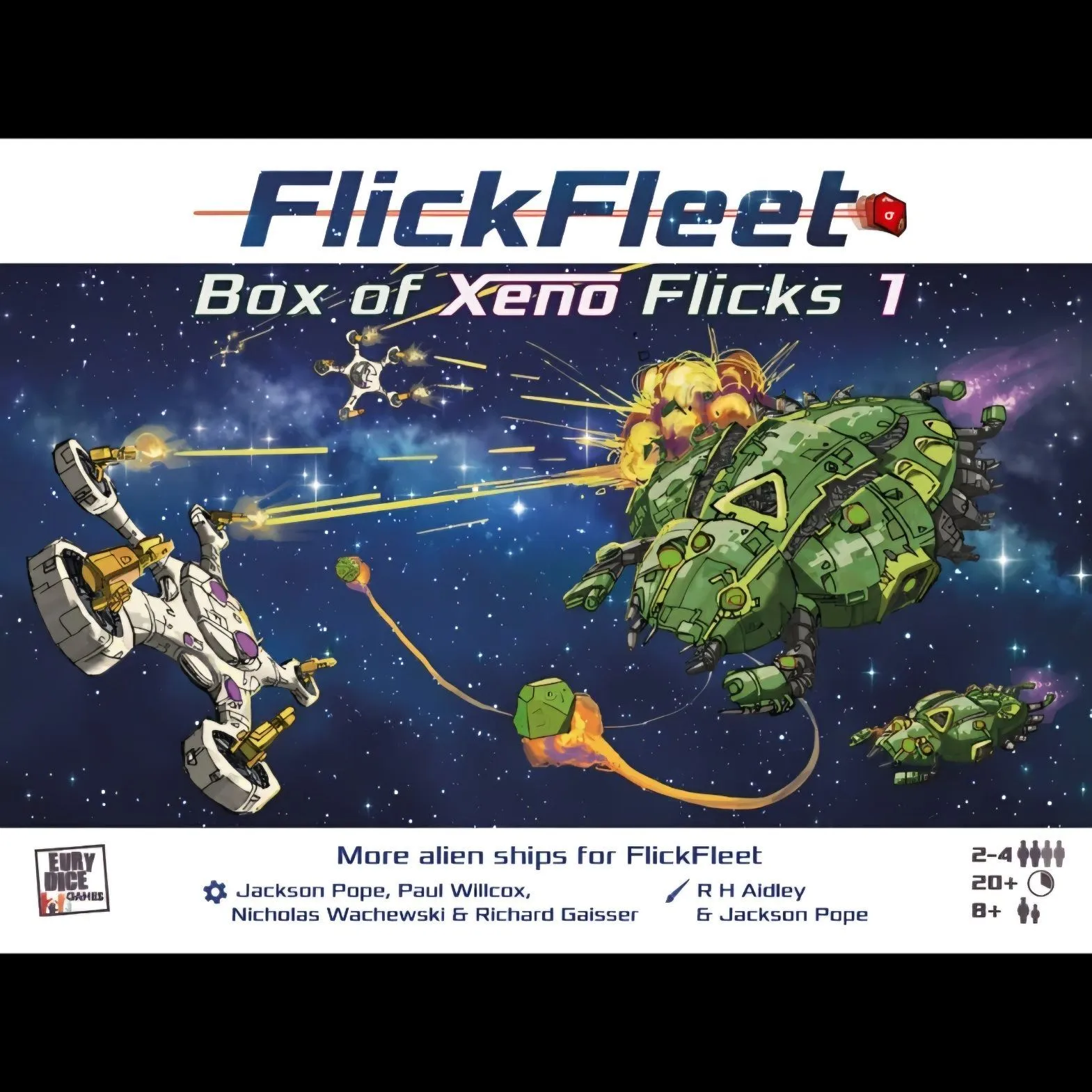 FlickFleet: Xeno Wars is a new stand-alone expansion for FlickFleet - the space combat dexterity game. You can play two-player games using nothing but Xeno Wars, or you can combine it with the FlickFleet base game (and any of the previous three expansions: Scenario and Scenery Pack, Box of Flicks 1 and Box of Flicks 2) to play with up to 4 players (5 with Box of Flicks 2 as well).