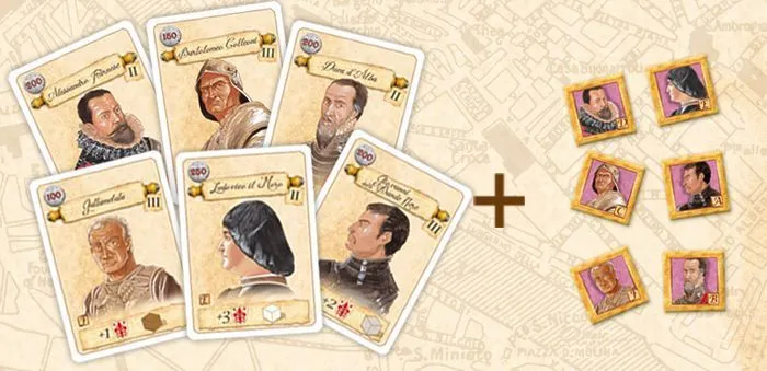 “We apologize if we included some characters in the game who never worked in Florence during the Renaissance, but we wanted to include all of the most important artists (in our opinion) from that golden age of Italian art and culture. Michelangelo, for example, left an important mark on the history of the city—and the Renaissance period—even if he was only in Florence for a short time. We also added some portraits of military leaders (created by Ivan Zoni) to the rulebook. They are not involved in the game, but they were influential members of public life during this era. The names of the buildings, parts of the Cathedral, and the workshops are in the literal form they had in Italy during the 1400-1600 period. Some of them are unchanged in the modern Italian language, some have changed a little, and others have completely disappeared or remain only in some dialects. We chose to maintain those words, without translating them into a language that the real artists didn’t know. We hope you agree with our choice, and we hope you have a good time playing Florenza!”