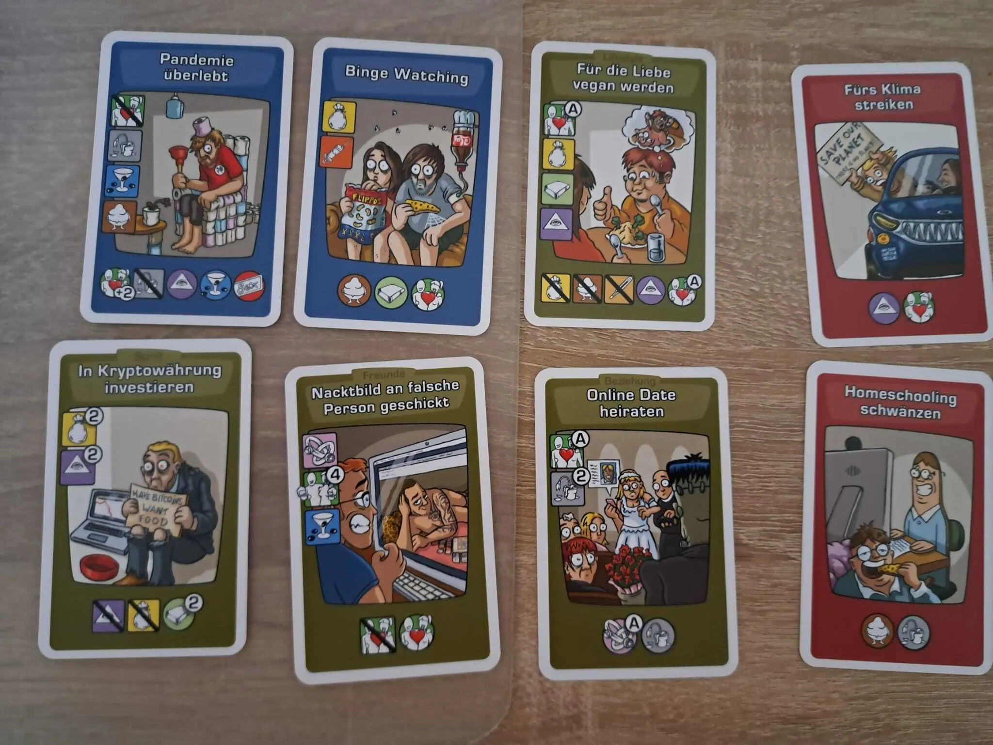 Each player plays a character who starts the game as a teenager and then must choose the cards that will make his life take shape. He can repeat a school year and get new friends, start smoking, take part in a Bible discussion group and have his first sexual intercourse during Oktoberfest – all very realistic. Every event in the life of a character has some effect on his main characteristics - tobacco addiction, alcohol addiction, drug addiction, wealth, health, sadness, spirituality and wisdom. Excess comes at a price, though, and when a characteristic gets too high, it cancels another one – if you smoke too much, you get thin; if you get too fat, you must stop drinking; if you drink too much you lose your wisdom, and so on – once more, very realistic. During game, you can get friends, and often more, with other player’s characters. This is an important feature in the game, since what happens to you usually affects, in good or bad, your friends, and this is one of the main interaction aspects of the game.