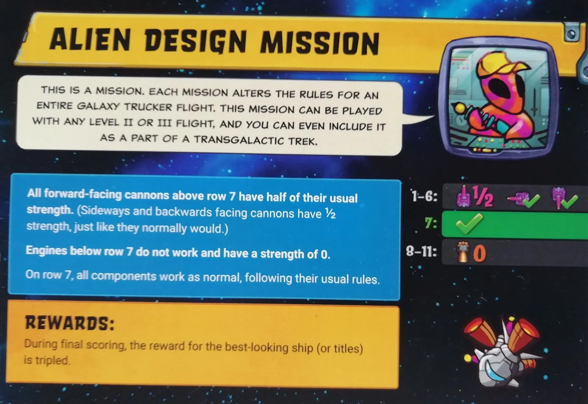 Dans ce jeu familial rapide et loufoque, 2 à 4 joueurs commencent par fouiller simultanément dans l’entrepôt commun, en essayant frénétiquement de récupérer les tuiles de composants les plus utiles pour construire leur vaisseau spatial, le tout en temps réel. Une fois les vaisseaux lancés, les joueurs devront faire face à des situations dangereuses tout en se disputant les opportunités financières - chacun espérant obtenir la cargaison la plus précieuse et finir avec la plus grande partie de son vaisseau encore intacte. Bien sûr, c’est plus facile à dire qu’à faire car de nombreux dangers enverront des morceaux de votre vaisseau, de votre cargaison et de votre équipage dans les profondeurs de l’espace. Le but est de survivre à la traversée (en espérant qu’au moins une partie de votre équipage et de votre vaisseau soient intacts) et d’avoir au moins un crédit à la fin du jeu (un profit, youpi !). Les joueurs gagnent des crédits en livrant des marchandises, en battant des pirates, en ayant le plus beau navire et en atteignant leur destination avant les autres.