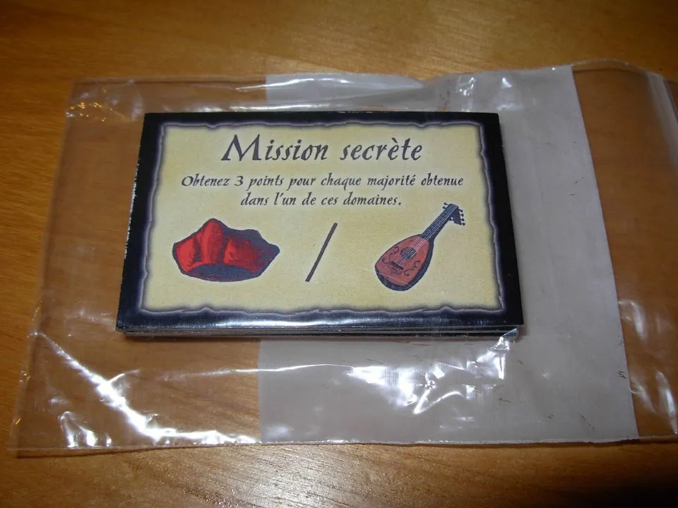 In more detail, the game lasts six rounds, and at the start of each round, each player reveals a random goal card worth 1-5 victory points (VPs), each with one of six symbols printed on it. Each player has a deck of influence cards and starts with a hand of three cards. On a turn, a player plays a card face down in front of a goal card, then draws a replacement card; if a face-down card is already present at this goal, the player reveals in and executes the action on it, if any. As soon as all goals have as many cards below them as their VP value, the round ends. Reveal the face-down cards without executing their actions, then carry out the actions of any mercenaries, wizards, witches, and princes/squires in play. Whichever player then has the most influence on a goal (as determined by the values on their played cards) claims that goal, with ties being broken in favor of whichever tied player played on that goal first.