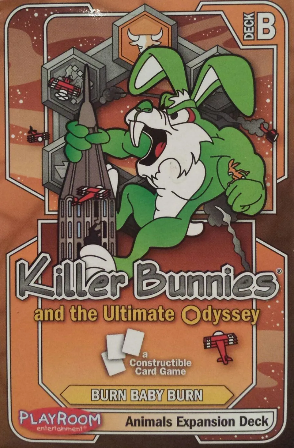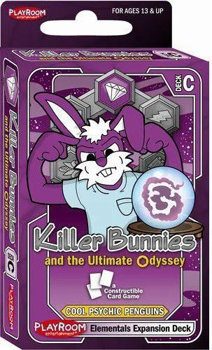When the insatiable appetite of Killer Bunnies game fans demanded more, Playroom looked to Killer Bunnies creator and game designer Jeffrey Neil Bellinger to coordinate the development of, like other games in the Killer Bunnies family, a non-collectible game that can offer variations through different color nick-named deck options. However, this time a new desire expressed by the huge Killer Bunnies fan-base has been fulfilled: Killer Bunnies now has a constructable game variation. Though still not collectible or random, players can now buy starter decks and booster expansions for Killer Bunnies and the Ultimate Odyssey and then use any combination of those cards to form their own constructed decks to play against opponents. Unlike in Killer Bunnies and the Quest for the Magic Carrot, where up to eight players play with the same deck of cards, all sharing the same draw pile, Killer Bunnies and the Ultimate Odyssey has players each draw only from their own constructed deck of 60 cards. There are not any random packs, so players will always know which cards they are purchasing in a deck and they can buy the right products for their planned deck. For Killer Bunnies and the Ultimate Odyssey six brand new starter decks (red, violet, blue, yellow, green, or orange) allow players to construct a personalized deck with any of the cards of any deck.
