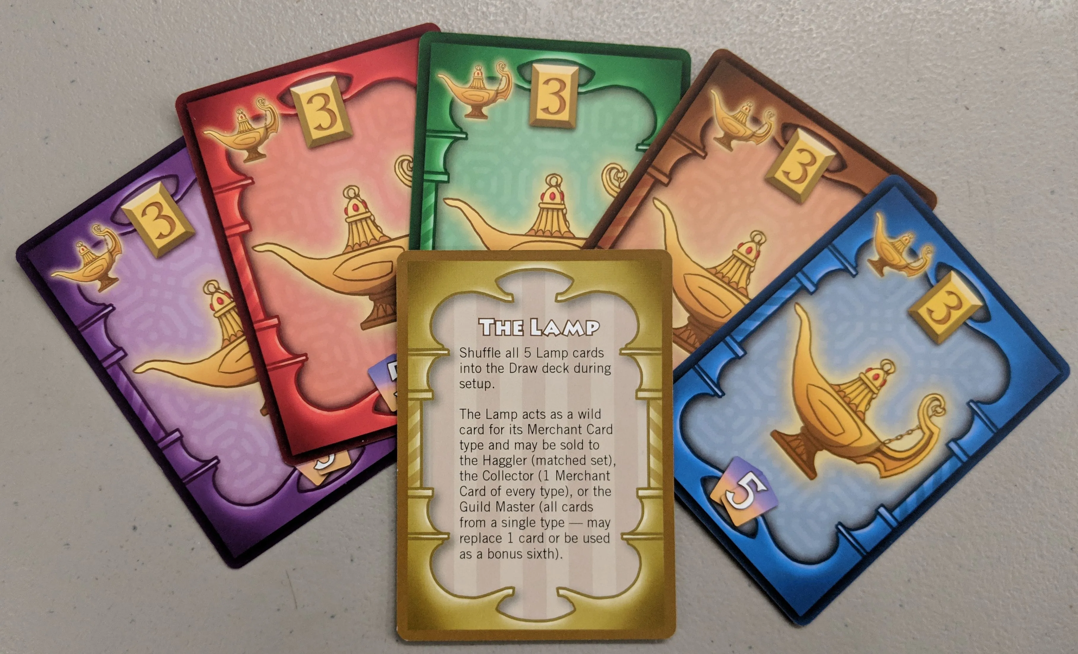 Hafid’s Grand Bazaar is played in a series of rounds based on the number of players. Each round consists of four phases during which players will take turns bidding on caravans, influence, and customers; collecting goods from caravans; trading and negotiating with each other to collect sets of goods; and selling their goods for maximum profit. Goods are divided into five categories, with five different items in each category. Players can see which categories of goods their opponents are holding by the symbols on the backs of the cards, but do not know the specific item the cards represent in those categories.