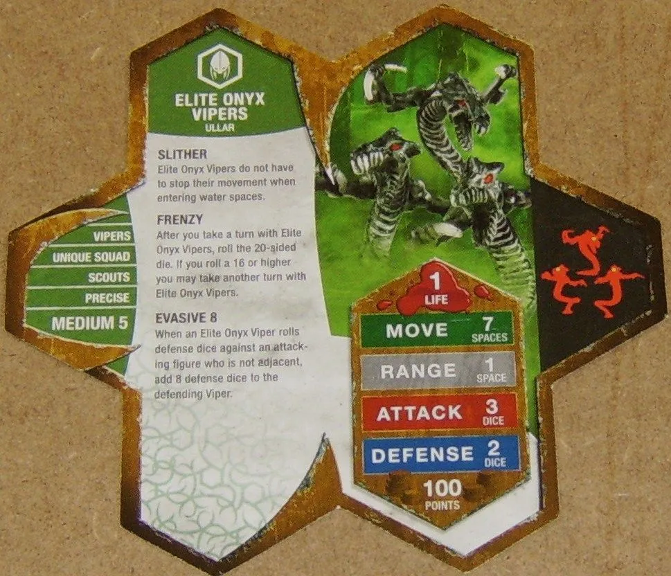This Fantasy Battle Board Game comes with dozens of painted plastic miniatures, each representing a warrior from a different era, and hex-based hard plastic terrain pieces which can be put together in many different ways. The warriors include 30 plastic figures, including World War II soldiers, futuristic robots, aliens, a T-Rex-riding orc, a large dragon, and many more. Each hero or squad has its own card that details both movement and combat abilities.