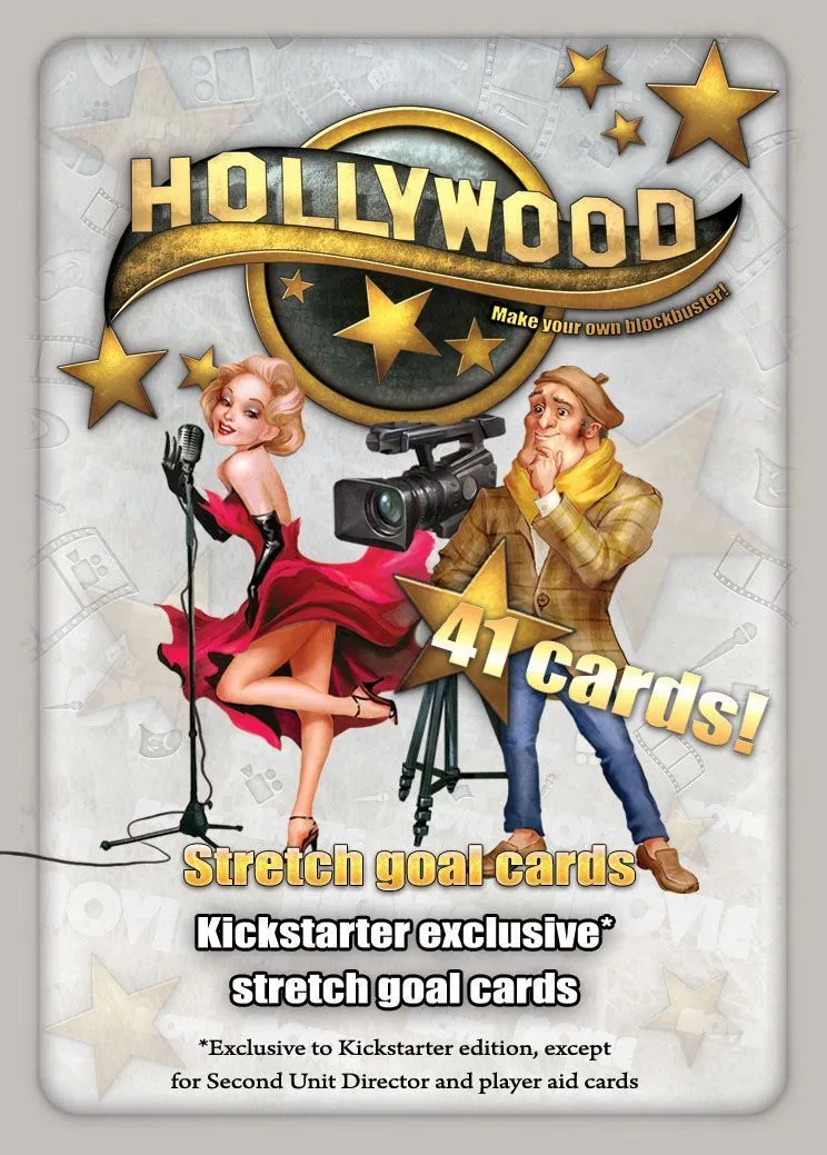 In the movie-making game Hollywood, each player is a studio boss who tries to produce the most successful blockbuster. Players construct movies from game cards that they draft or purchase. Players compete to get the most popular stars to perform in their movies because this brings them more money and more Hollywood Awards (which are pictured on some cards).