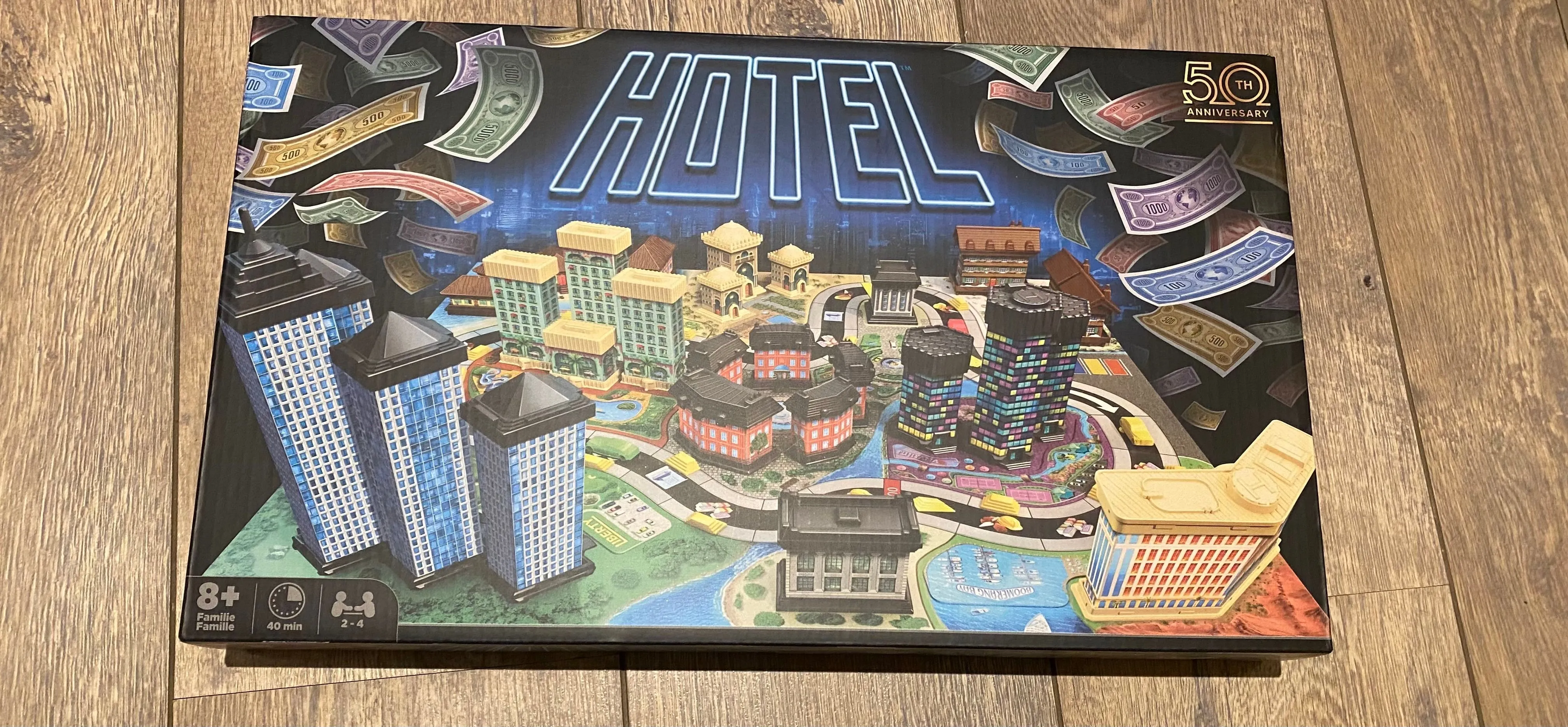 Players try to buy and build the best hotels in this game, earning the most money or bankrupting their opponents. A successful hotel consists of three components: the land on which it’s built, the hotel buildings, and the entrances by which guests arrive in the hotels. All three components need to be bought separately with in-game money. As in Monopoly, money is earned by players who end up on one of the entrances of your hotels, after their dice roll. The more luxurious the hotel, the more money a guest will earn you. Money you can use to build extensions to your existing hotels, buying new entrances or pay other players when you arrive at their hotels.