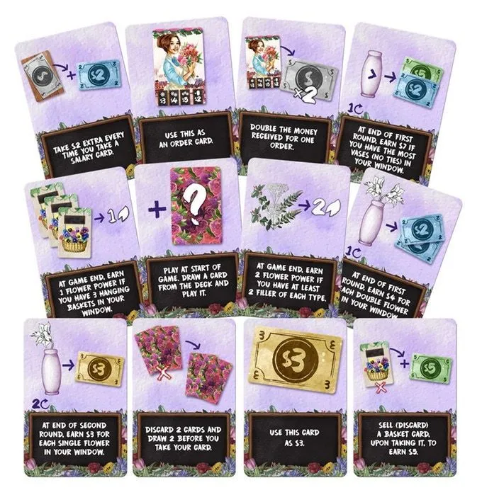 The Little Flower Shop is a light, yet strategic, set collection game featuring stunning artwork by botanical artist Sarah Wry. Mechanically, the game employs a familiar card drafting system of picking a card and passing the rest. The cards are then used according to their type. Vase cards are placed in a player’s shop window. Flower cards are tucked under the vases, provided they meet the vase’s requirements. Basket cards may be hung at the top of a player’s window, but only if they can buy the baskets first. Salary cards provide free income. Sale cards allow players to sell flowers to put additional funds in their register. At the game’s end, players score points for the best display of flowers in their windows.