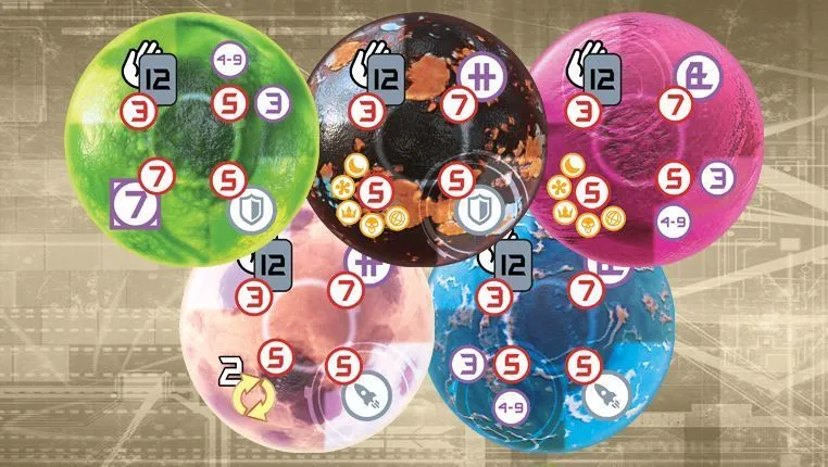 Each turn is divided in three different phases: Trade, Display and Draw cards. Each player at his turn can make a trade offer and each player in turn responds in kind. Using the cards through trading and drawing players work to acquire five identical race cards in order to build a Space Station (which increases the number of cards you can draw each turn) or five identical technology cards in order to build a City (which gives Victory Points). A variant play has been created in this game where each player, owns a planet divided in four different missions. If a mission is accomplished, more Victory Points are added to the sum and if a player completes all missions game ends.