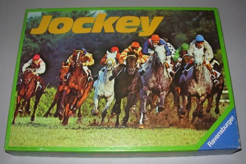 1970s releases by Otto Maier Verlag are reportedly the same as the 2001 re-release by Berliner Spielkarten. Components and graphics have changed (some early Ravensburger editions had metal horses and/or felt “boards”), but reportedly the rules have remained unchanged. Jockey was originally published in the Ravensburger Casino Series. Jockey was also published in the compilation of Bertelsmann Buchclub in 1976 (see Jockey & Grand Prix).