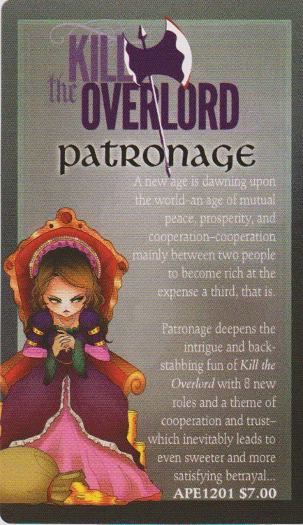 Kill the Overlord is a fun, fast-paced game of political murder for 4 to 8 players that can be played in about twenty minutes. The goal of the game is simple: Eliminate other players by sending the Overlord’s executioner after them, while at the same time saving your own skin. Each time a player dies, his survivors climb another rung up the political ladder, taking the deceased’s title and all the wealth and power that comes with it. The player who can secure enough wealth and the title of Overlord first will become the True Ultimate Supreme Overlord (and win the game).