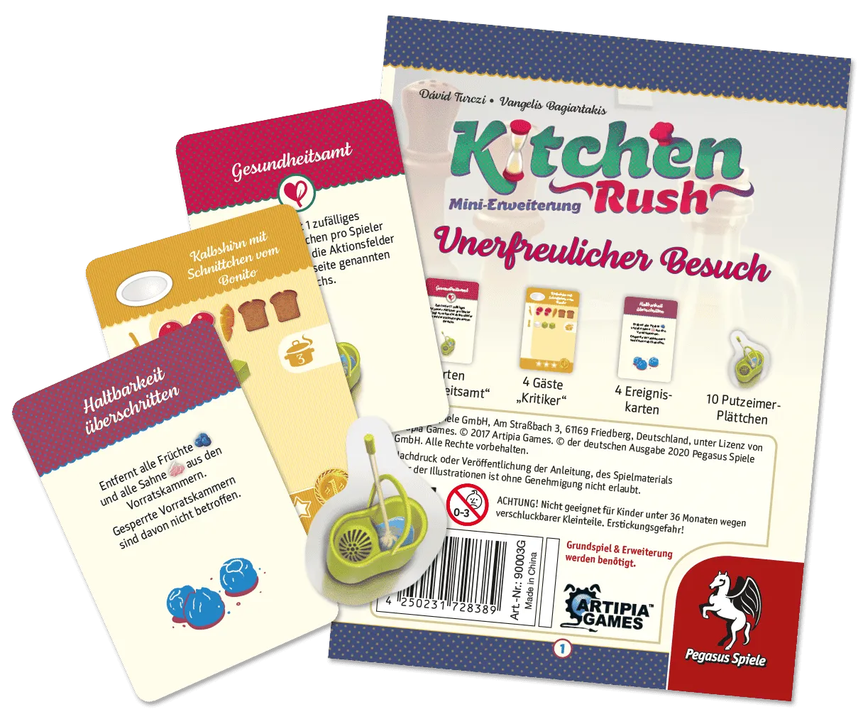Vous venez d’hériter d’un vieux restaurant et vous devez en faire une entreprise prospère! Embaucher du personnel, commander les bons ingrédients et être prêt à servir les clients. Le succès dépendra entièrement de votre efficacité en cuisine! Kitchen Rush est un jeu coopératif en temps réel novateur qui simule l’excitation d’une cuisine de restaurant en plein coup de feu. Il le fait par le biais du placement de sabliers. Ces sabliers sont utilisés pour prendre les commandes des clients, préparer leurs plats, les servir à l’heure, acheter des provisions, nettoyer les assiettes et s’assurer qu’assez d’argent rentre chaque tour pour couvrir les salaires, les dépenses, les investissements et, espérons-le, dégager un profit. Tout sablier placé sur un espace d’action ne peut pas être utilisé ailleurs avant qu’il ne se soit écoulé. Le jeu est pour 1-4 joueurs et se joue pour 4 tours de 4 minutes.