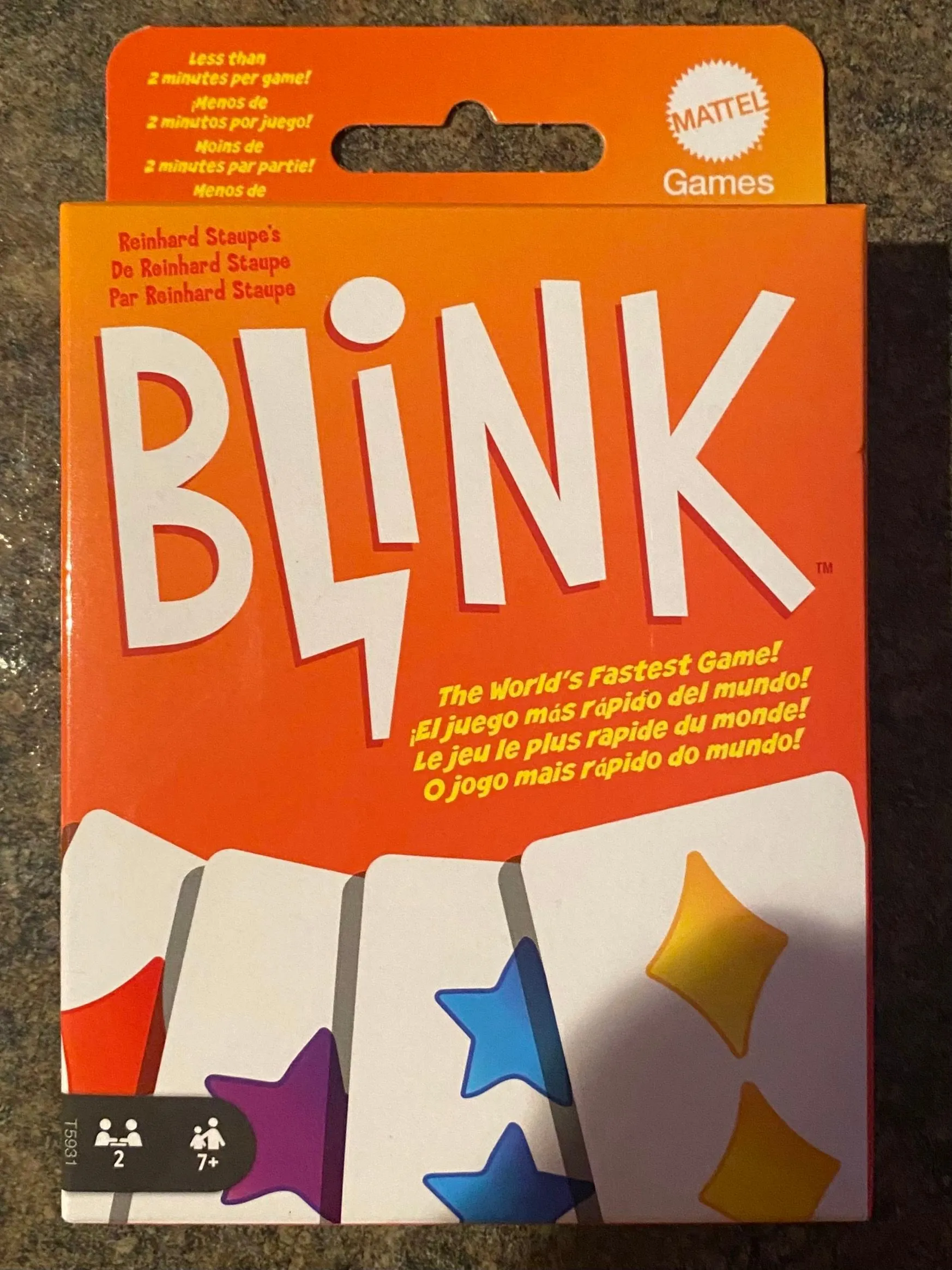 The two-minute-long, two-player card game Blink bills itself as the fastest game in the world. Without taking turns, players race to empty their hands by matching the color, shape, or number of symbols on their cards in hand to the top card of the two discard piles in the center of the table. As soon as a player lays down one card, they can draw another, up to the hand size of three cards. If both players can’t play, they can both draw a card directly onto the discard pile at the same time and then continue play. The first player to empty their hand and draw pile wins.