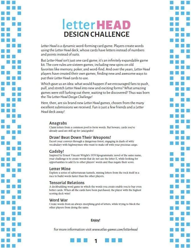 Actually many games (14) in the same box. Equipment is a set of cards each showing one letter and a point value (there are also wild cards).