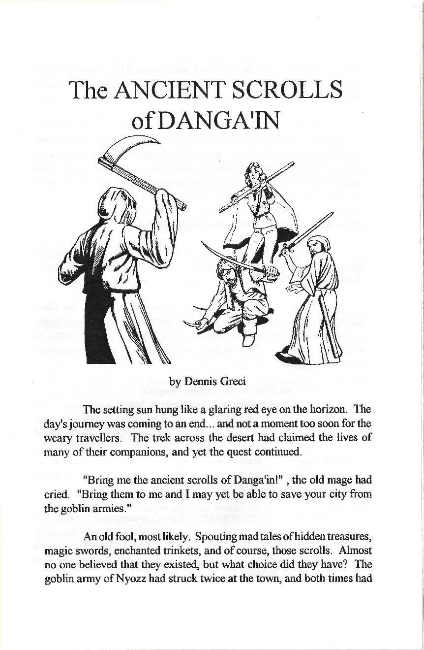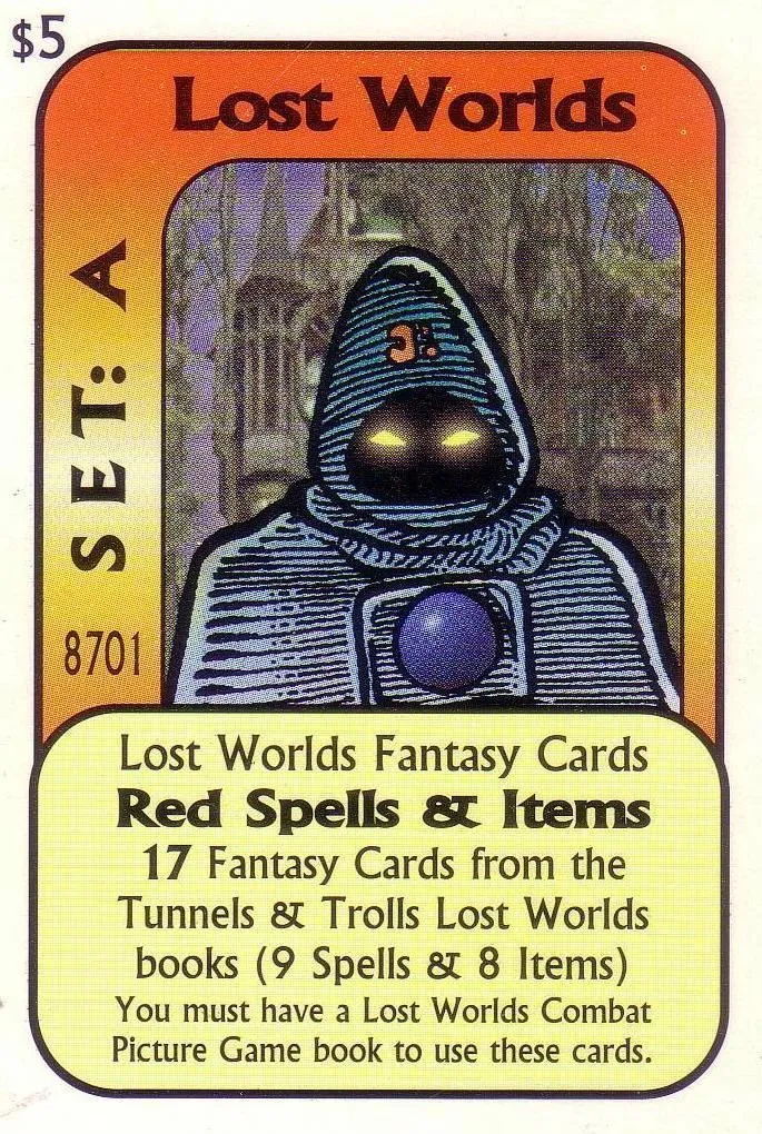Lost Worlds is the most popular entry in Alfred Leonardi’s line of book games, which also includes Ace of Aces. Each player has a character card and a booklet (and sometimes special Tactics, Luck, or Spell cards) for one of about fifty (and growing) medieval-fantasy characters. Characters can range from barbarian warriors to animated skeletons to elven archers to unicorns — even two different dragons. Booklets are traded and, as each player selects a move, a reference grid in the books determine the results (wounds, off-balance maneuvers, and so on). Combat continues until one fighter or the other expires.