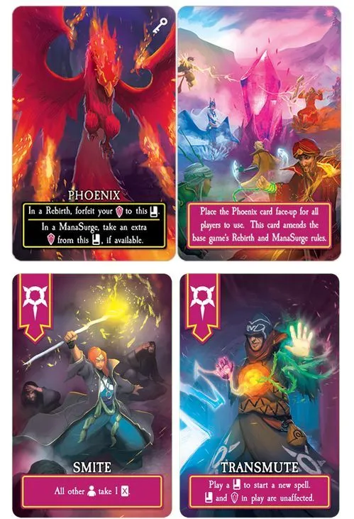 Players take turns casting an initial spell that will set the rule for the round, set the rank other players must beat, and earn them a potential Shard (VP). Players then take turns playing cards of equal or higher rank from their hands to the table; if they match the spell suit, they place a Shard on that card. The round ends when a player can no longer play a valid card from their hand. The player that could not play a card returns any Shards on their played cards back to the center, then takes card damage equal to the amount of Shards that are still on cards. All other players then take the Shards on cards they played to their Victory Pool. The player who played the last card gets a bonus Shard.