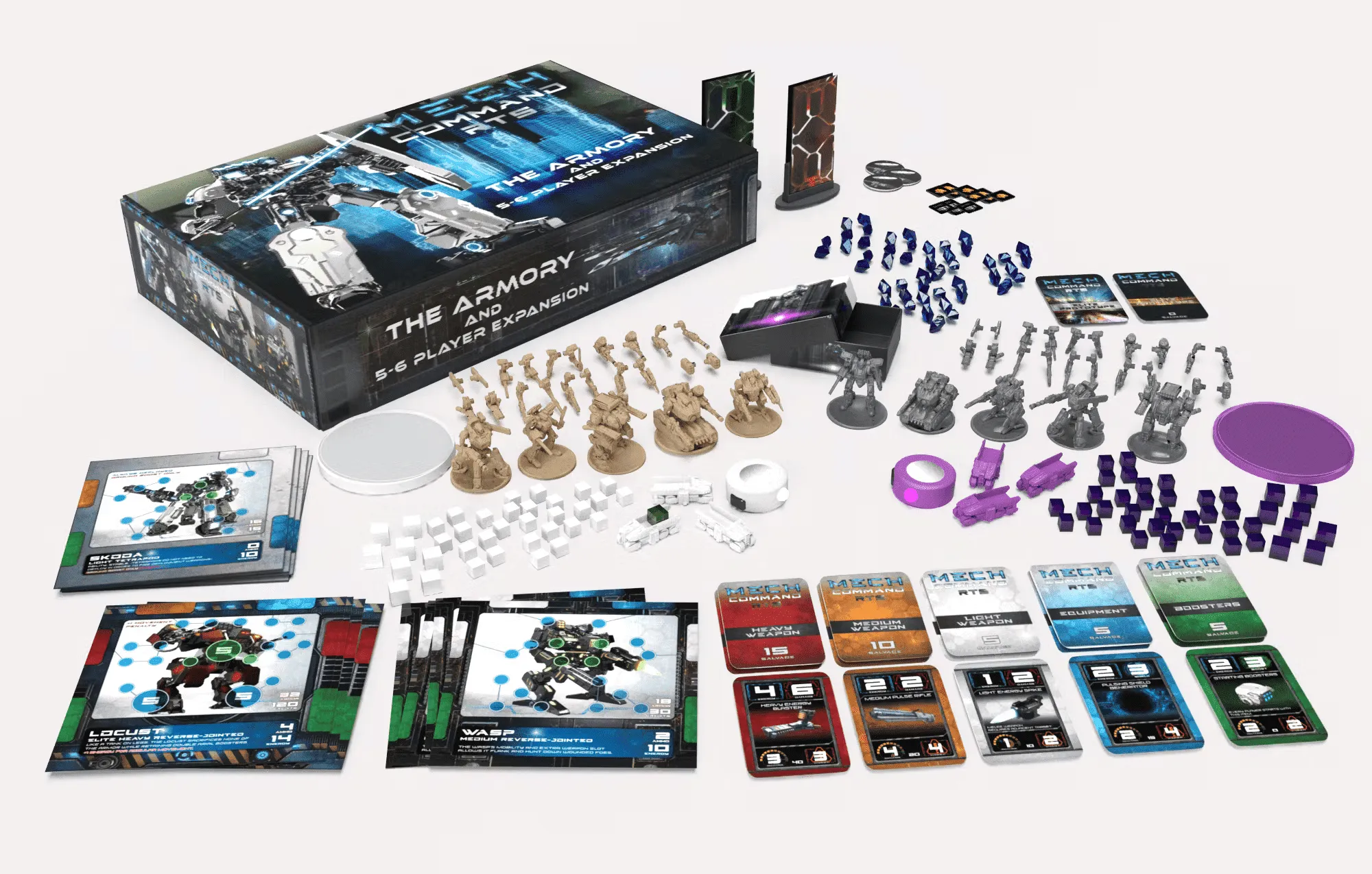 The first board game of its kind, Mech Command RTS has been designed to be fast to setup, fast to teach and fast to play. Featuring unique components like LED pointers built into each miniature’s base to provide instantaneous line of sight as well as physical buildings to provide cover and a rooftop level.