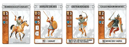 Each card in your hand represents one of your army’s units, which has the same strengths and weaknesses as its historical counterpart. Units are rated for speed, attack strength, defense strength, and other modifiers based on battlefield performance. Leader cards offer combat bonuses and have their own unique abilities — but be warned that not every leader card is an Alexander or Hannibal!