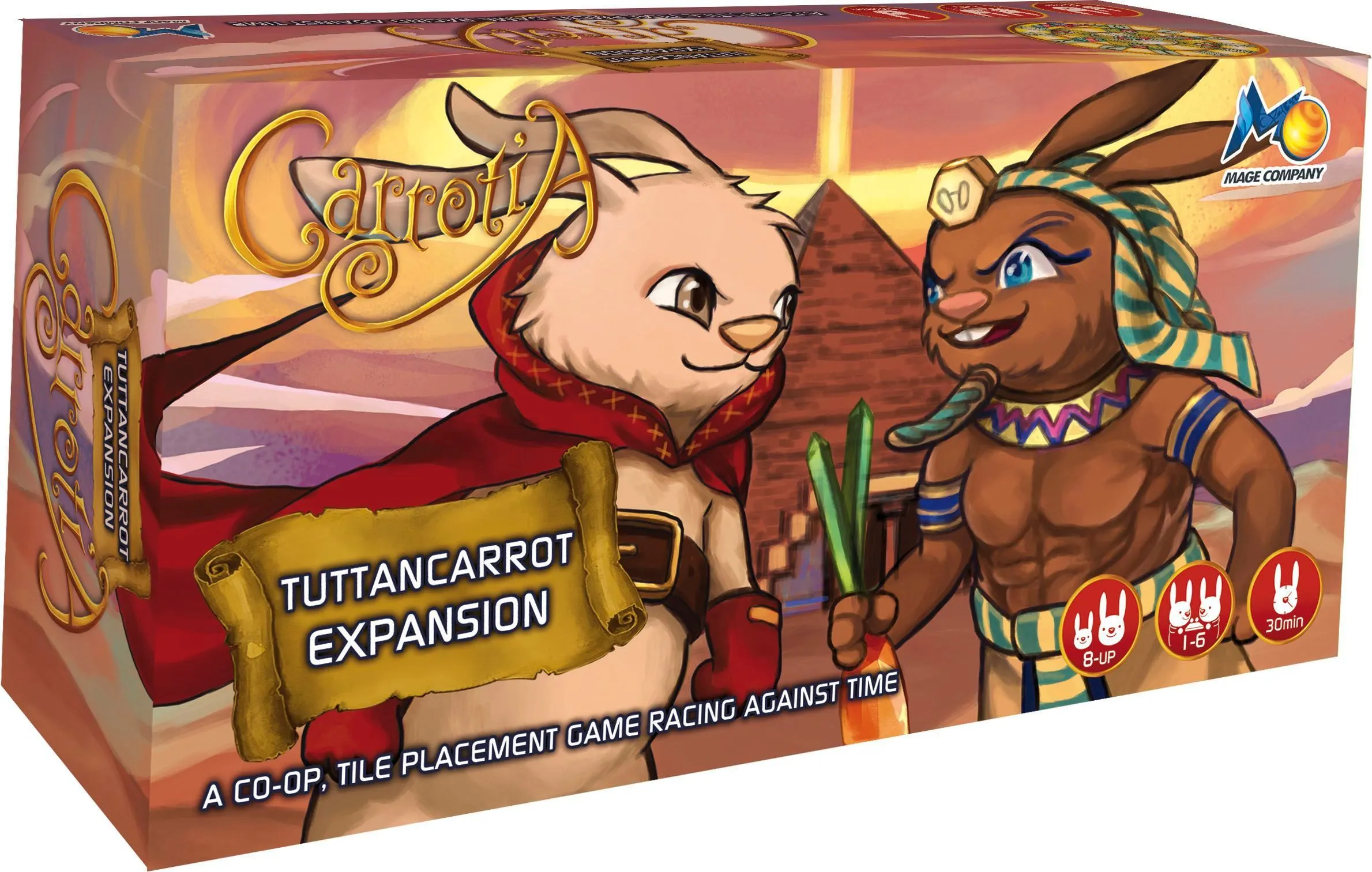Carrotia is a light co-operative, tile placement game for 1-6 players where the team collectively works together against a timer to build three different mazes of increasing size. The master rabbit needs to dash from entrance to the exit within a specific number of moves according to the current mission card, scooping up the precious carrots while avoiding the owl, hawk and other birds as they swoop low over the zones causing mayhem and mischief.
