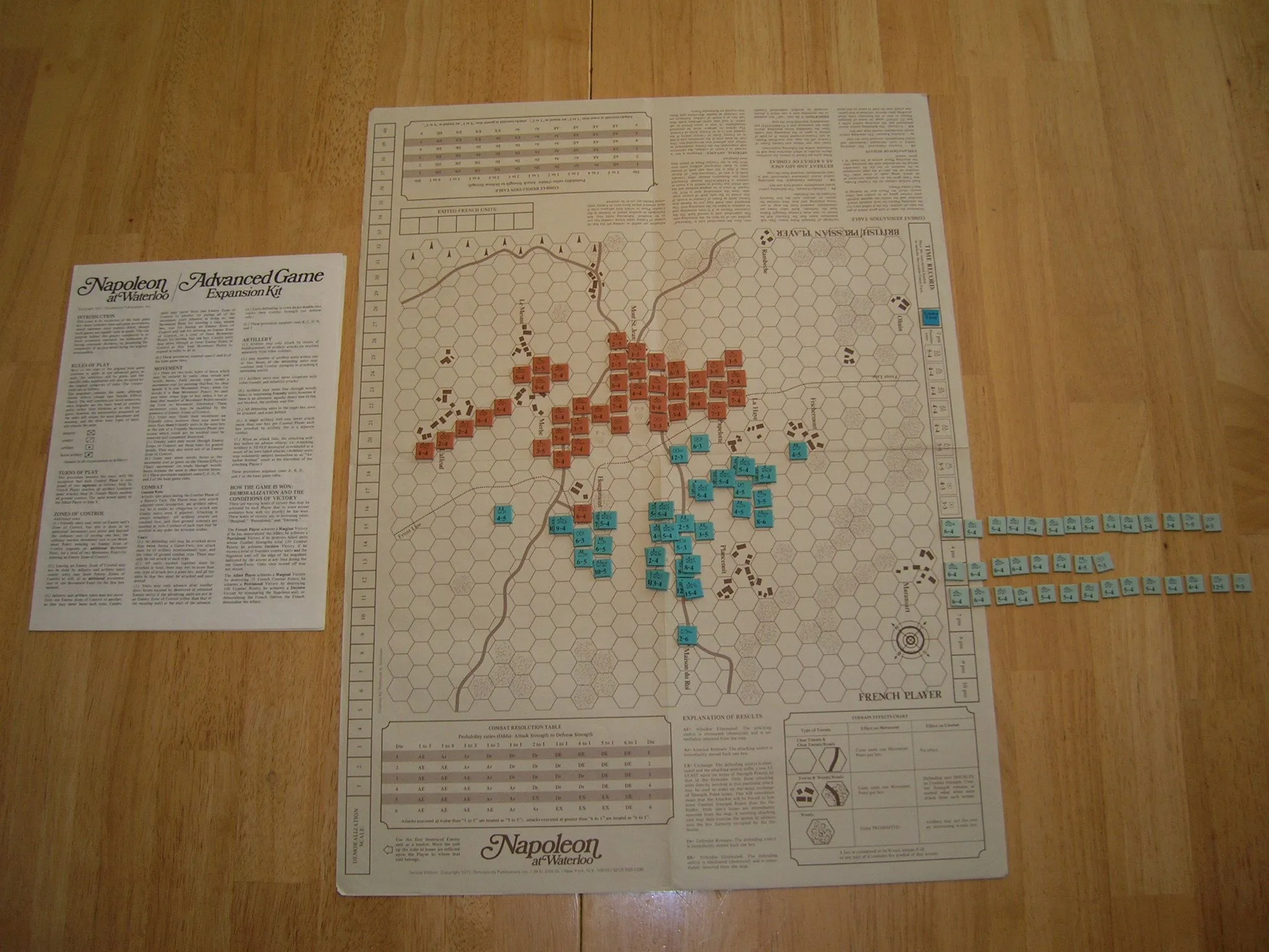 Le jeu est facile et rapide à jouer, et peut être fini en 2 heures. C’est donc une représentation réaliste et précise de la bataille de Waterloo. Chaque hexagone et chaque pion est imprimé avec un numéro pour le rendre la mise en place plus simple. La carte est une belle reprétation du champ de bataille tel qu’il fut réellement et les pions disposent d’illustrations précises des uniformes que portaient les différentes unités à Waterloo.